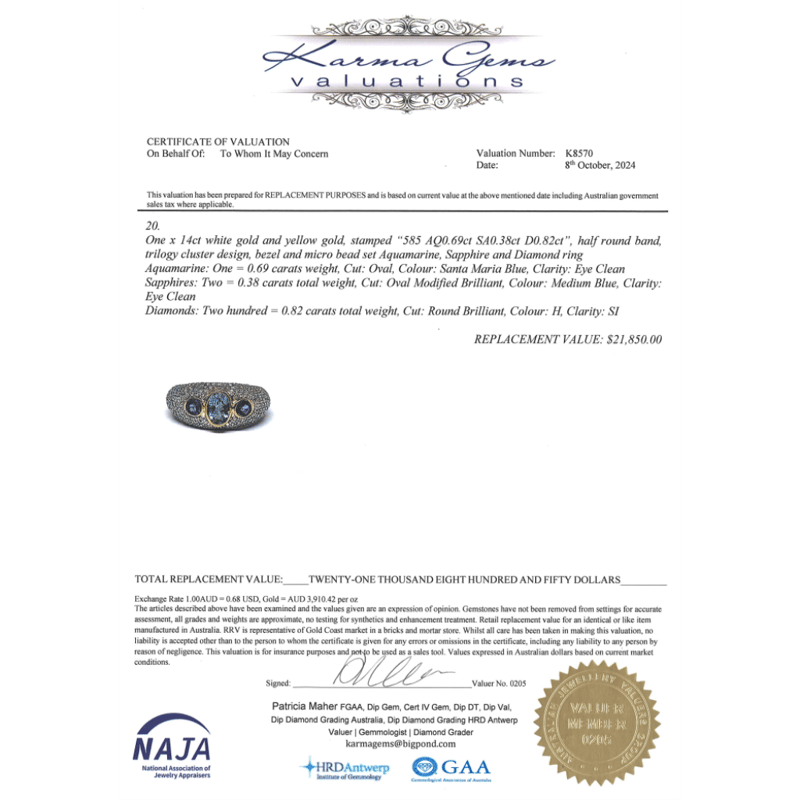 The Central Design Features, One Oval Cut, Santa Maria Blue, Aquamarine (0.69Ct, Eye Clean Clarity), Bezel Set In Yellow Gold. Accompanying The Design Are, 2 Oval Modified Brilliant Cut, Medium Blue, Sapphires (0.38Ct Tsw, Eye Clean Clarity), Bezel Set In Yellow Gold. Encompassing The Design Are, 200 Round Brilliant Cut, Diamonds (0.82Ct Tdw, H Colour, Si-Clarity), Micro-Bead Set In White Gold. Ring Size N.