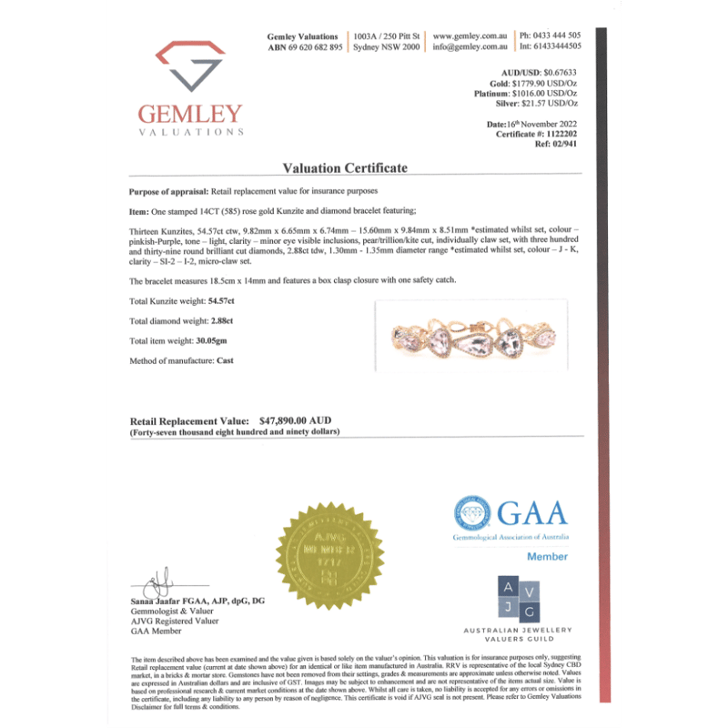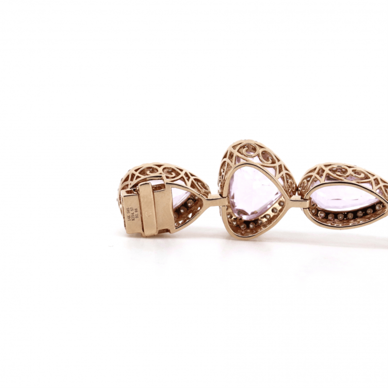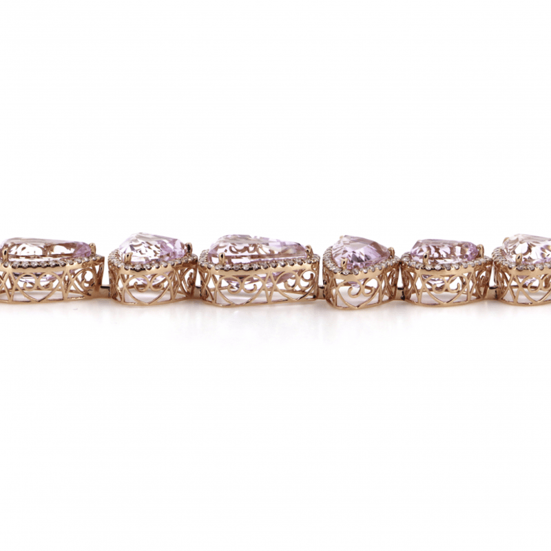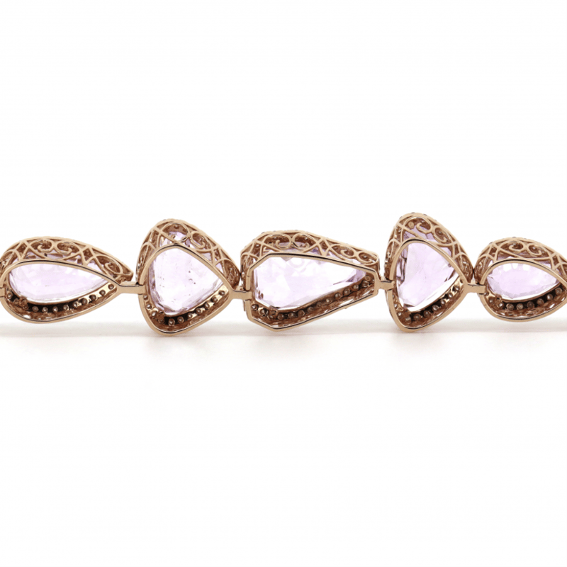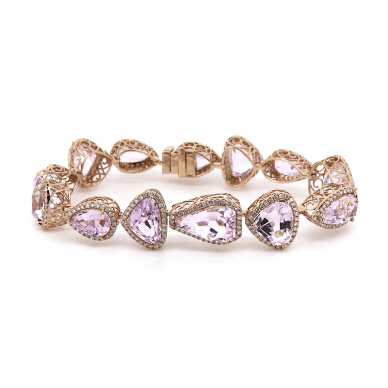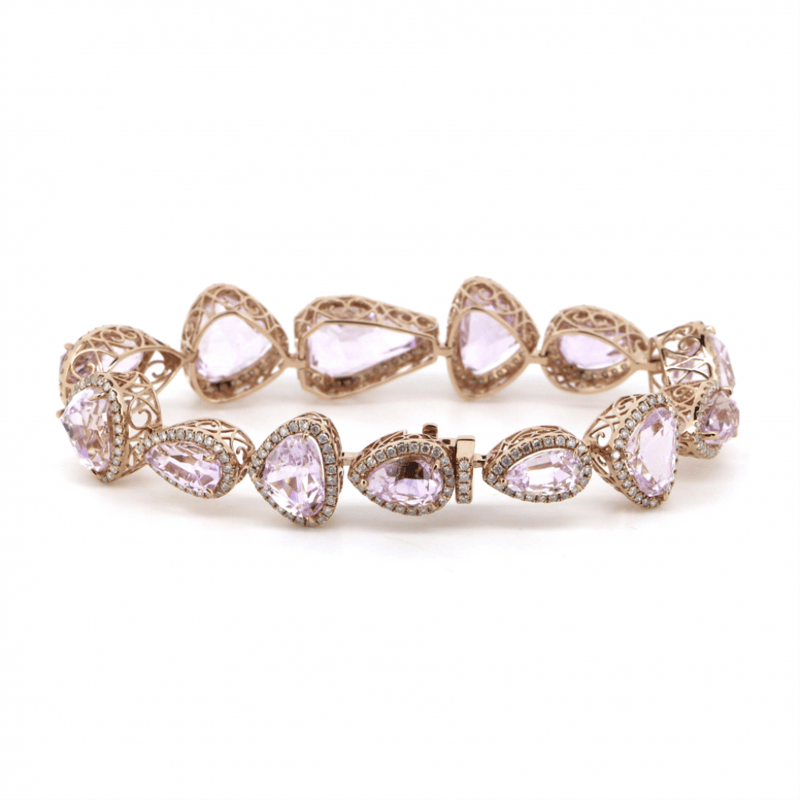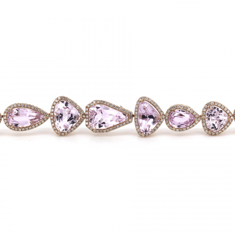 The Central Design Features, 13 Pear, Trillion And Kite Cut, Light Pinkish-Purple, Kunzites (54.57Ct Tsw, Minor Eye Visible Inclusions), Claw Set. Surrounding The Centres In Halos Are, 339 Round Brilliant Cut, Diamonds (2.88Ct Tdw, J-K Colour, Si2-I2 Clarity), Micro-Claw Set. The Bracelet Has A Box Lock Clasp, With One Safety Latch. Bracelet Length Is 18.5Cm.