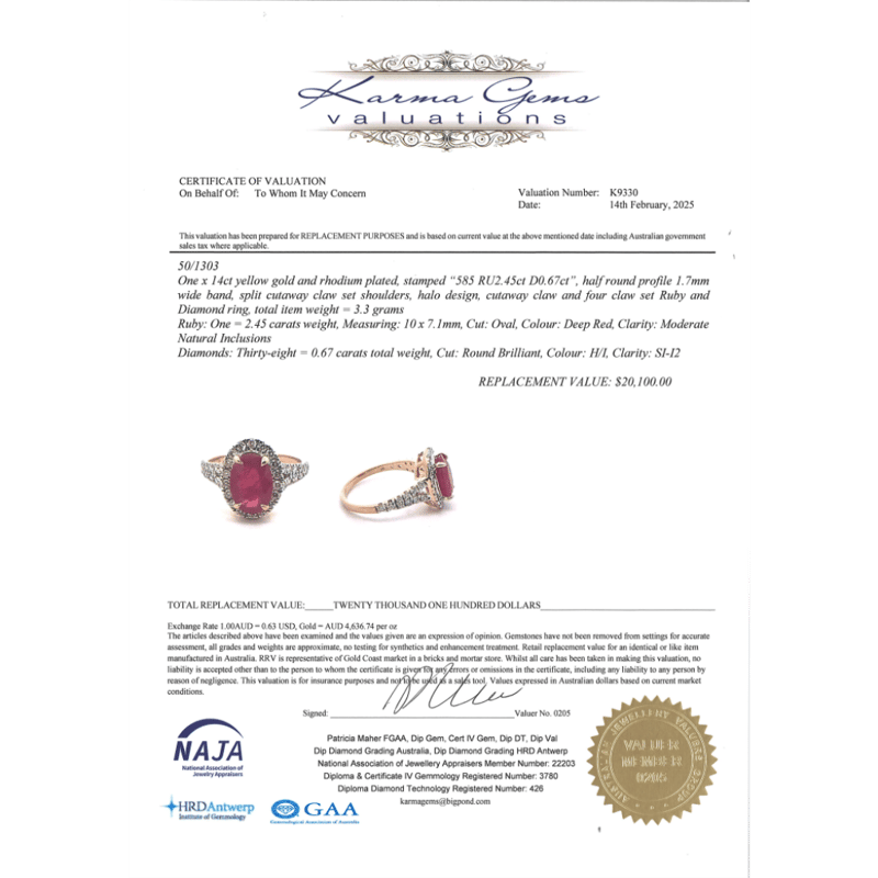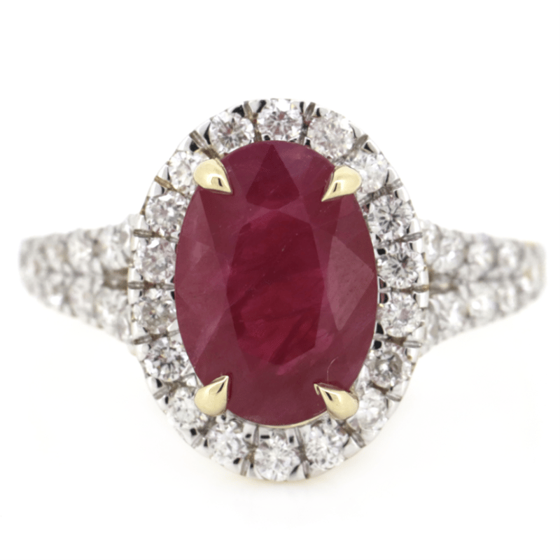 The Centre Features, One Oval Cut, Deep Red, Ruby (2.45Ct, Moderate Natural Inclusions), 4 Claw Set. Surrounding The Centre In A Halo And Decorating The Band Are, 38 Round Brilliant Cut, Diamonds (0.67Ct Tdw, H-I Colour, Si-I2 Clarity), Claw Set. Ring Size M.