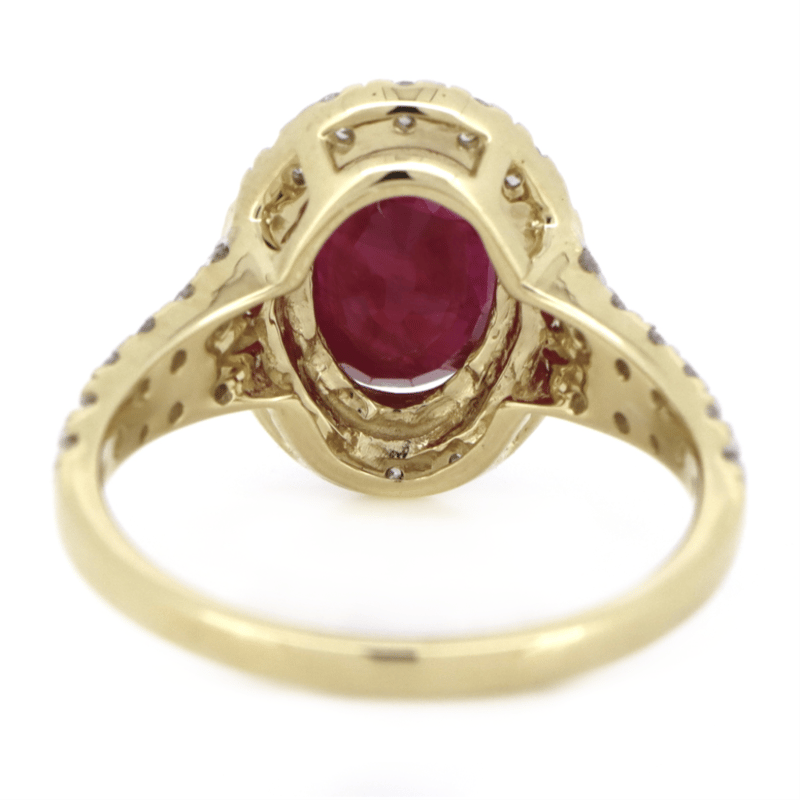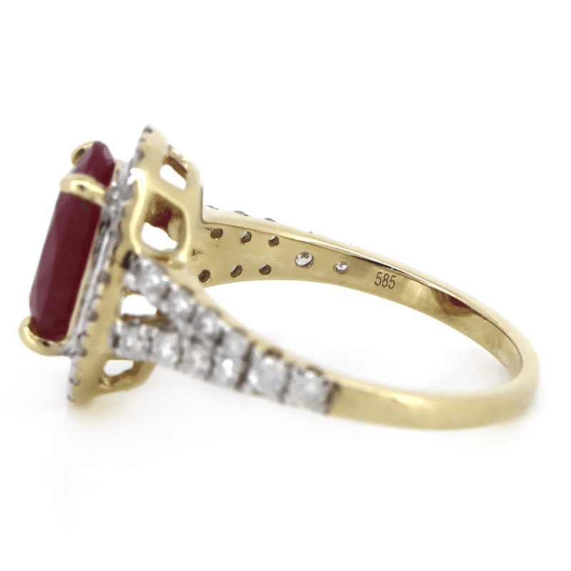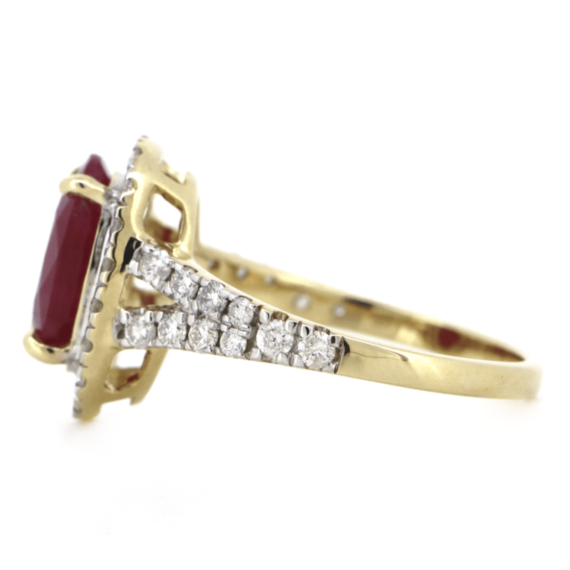14K YELLOW GOLD, RUBY AND DIAMOND, HALO RING.
