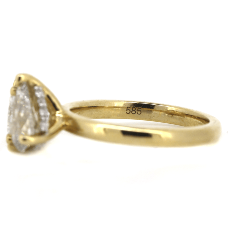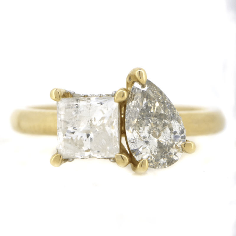 The Ring Features, One Pear Brilliant Cut, Diamond (0.75Ct, J Colour, I2 Clarity), Claw Set. Flanking The Centre Are, One Princess Cut, Diamond (0.96Ct, F Colour, I2 Clarity), Claw Set. Decorating The Band Are, 15 Round Brilliant Cut, Diamonds (0.06Ct Tdw, G Colour, Si-I2 Clarity), Bead Set. Ring Size I 1/2.