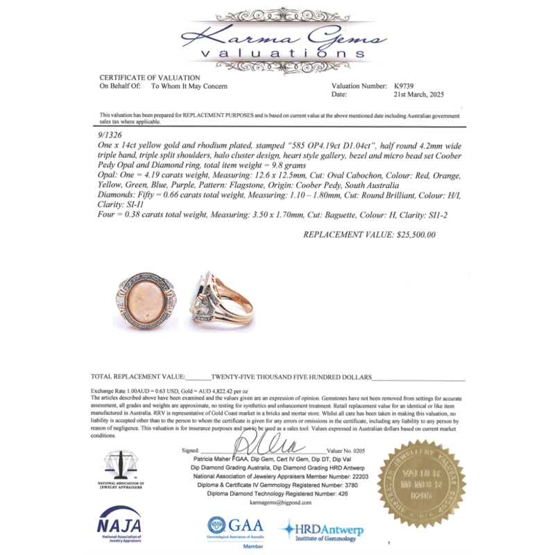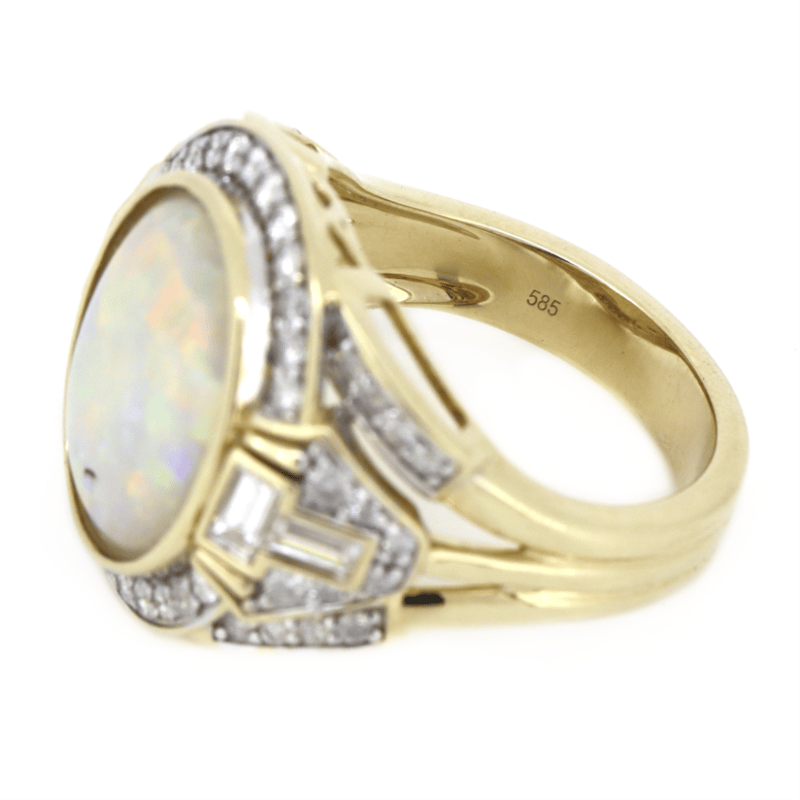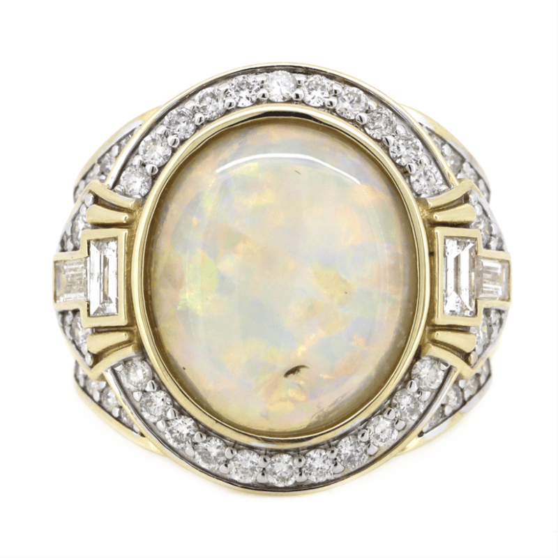 The Centre Features, One Oval Cabochon Cut, Coober Pedy Opal (4.19Ct, Red, Orange, Yellow, Green, Blue, Purple Colour Play, Flagstone Pattern), Bezel Set. Decorating The Shoulders Are, 4 Baguette Cut, Diamonds (0.38Ct Tdw, H Colour, Si1-Si2 Clarity), Bezel Set. Embellishing The Design Are, 50 Round Brilliant Cut, Diamonds (0.66Ct Tdw, H-I Colour, Si1-I1 Clarity), Bead Set. Ring Size O.