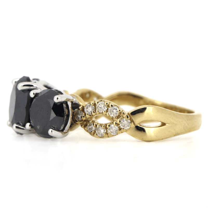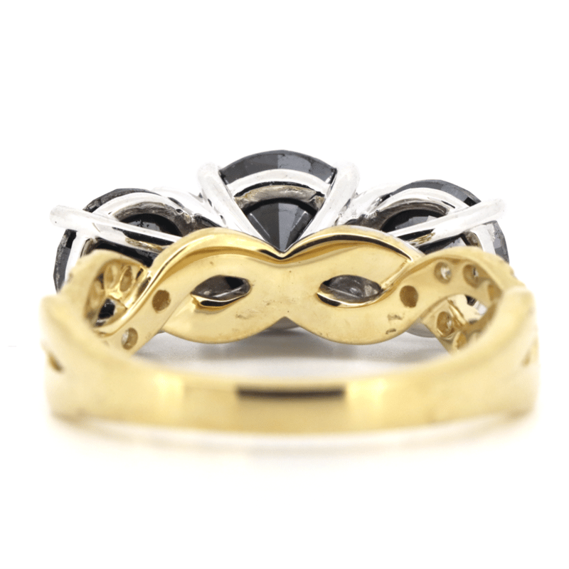 14K YELLOW/WHITE GOLD, BLACK DIAMOND AND DIAMOND, TRILOGY TWIST BAND RING.