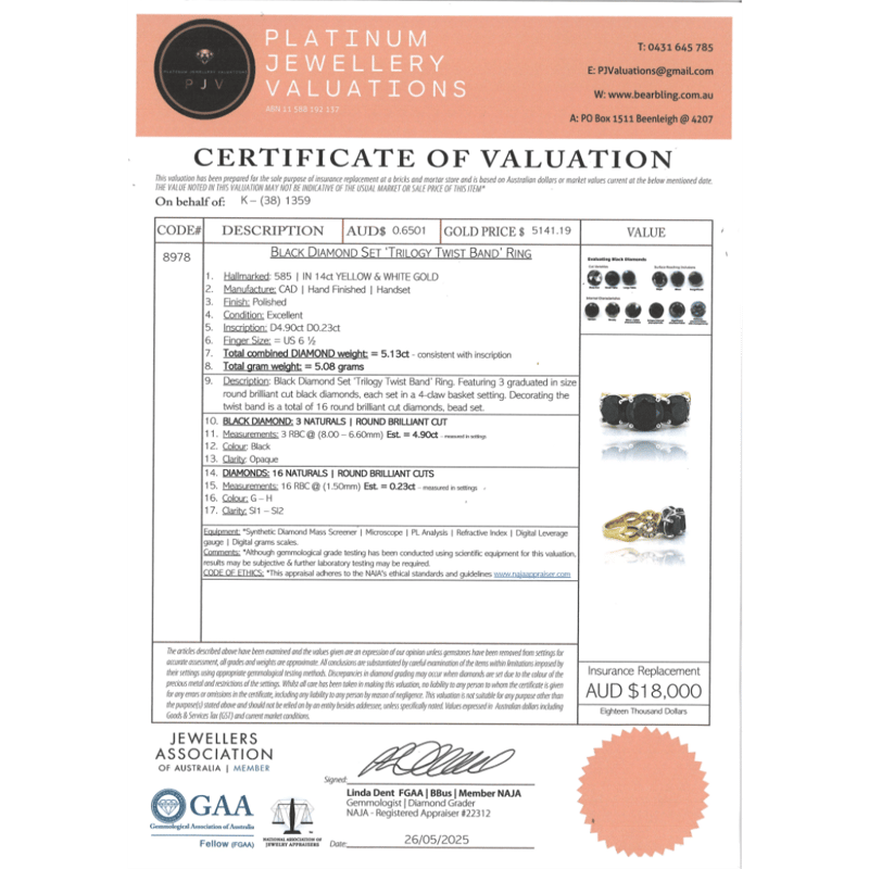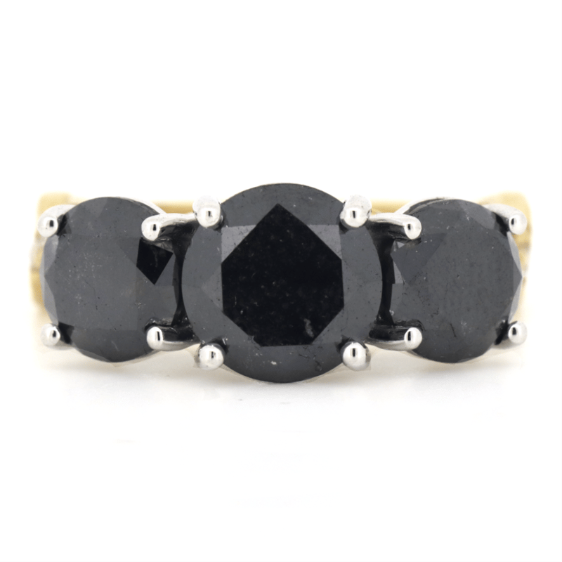 The Central Design Features, 3 Round Brilliant Cut, Black Diamonds (4.90Ct Tdw, Opaque) Claw Set. Decorating The Twist Band Are, 16 Round Brilliant Cut, Diamonds (0.23Ct Tdw, G-H Colour, Si1-Si2 Clarity), Bead Set. Ring Size M 1/2.