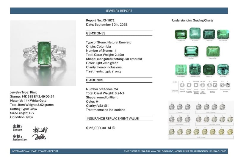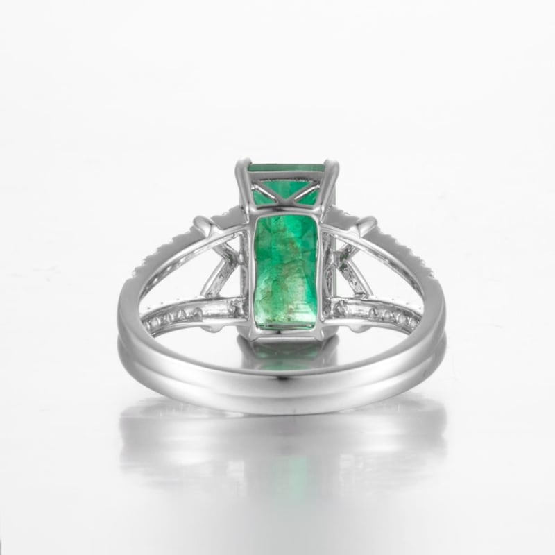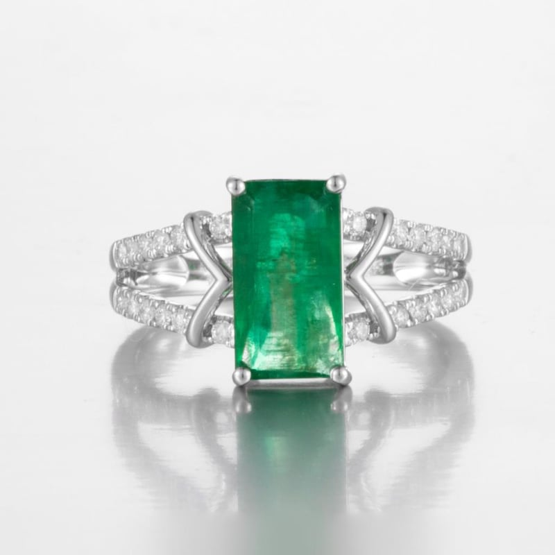 Featuring Centre, One Elongated Rectangular Emerald Cut, Light Vivid Green Colombian Emerald (2.49Ct, Heavy Inclusions), Claw Set, With 24 Round Brilliant Cut Diamonds (0.24Ct Tdw, H-I Colour, Vs2-Si1 Clarity), Claw Set. Ring Size O.
