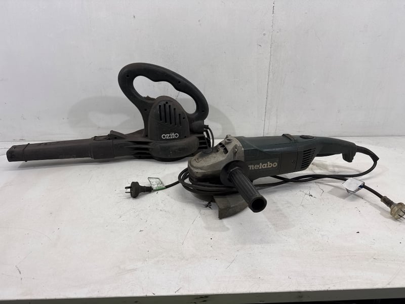 Blower/ Angle Grinder, Assorted Brands include Ozito/ Metabo, Models include OZBL1800WA and W 2200-230.