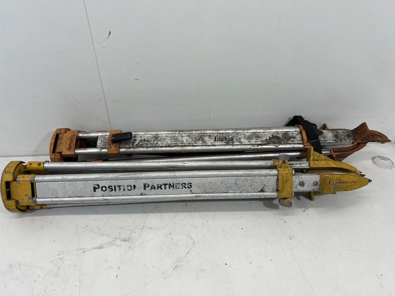 Surveying tripods, brands include; position partners and Lufkin, pointed steel feet, flat head design