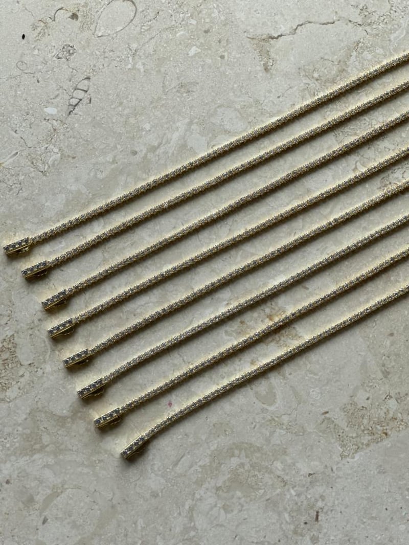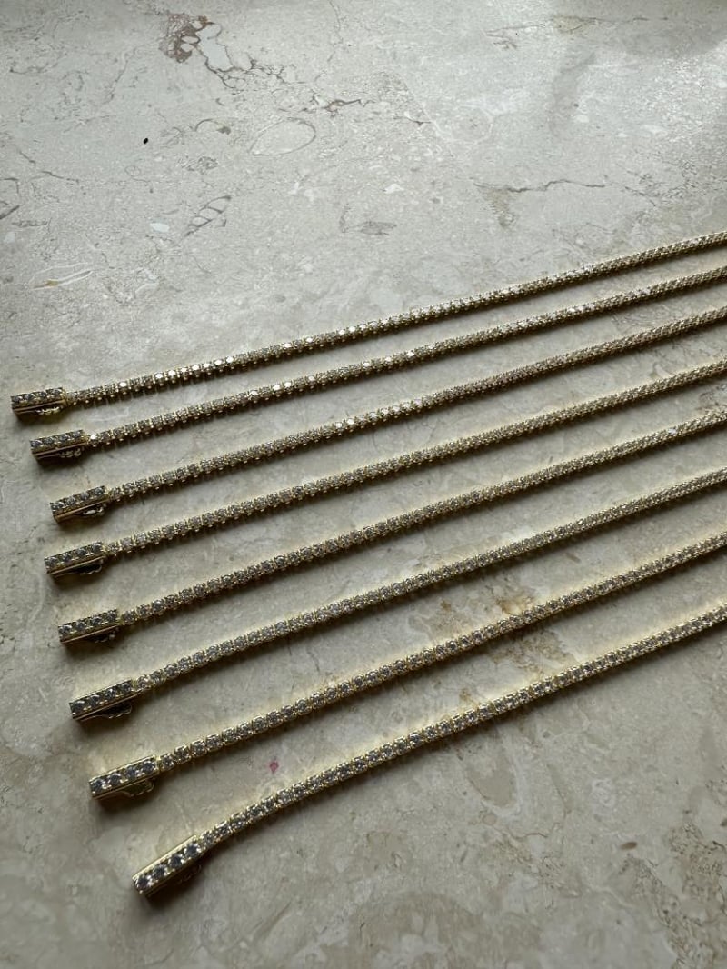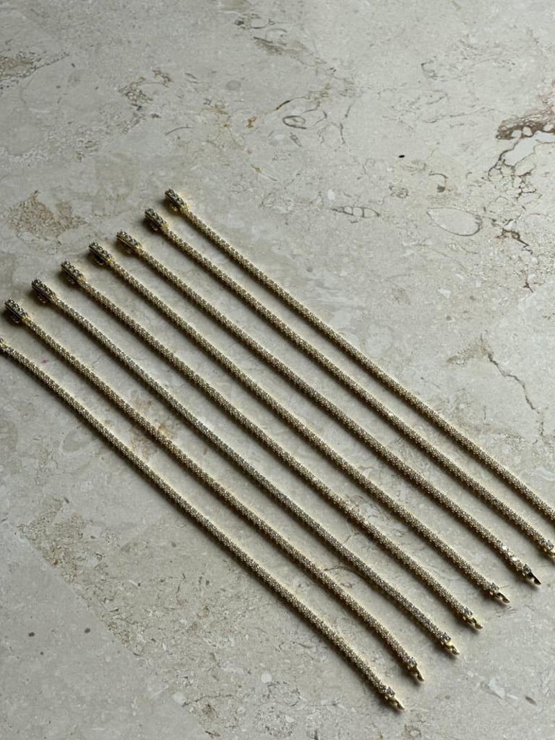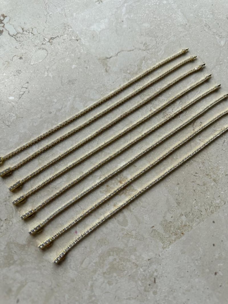BAG OF 8 X 925 STERLING SILVER 14 K GOLD PLATED TENNIS BRACELETS, 17.5CM