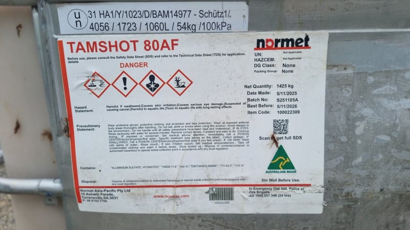 Tamshot 80AF 1000L IBC Pod, Contains Liquid Aluminium Sulfate, Diethanolamine.