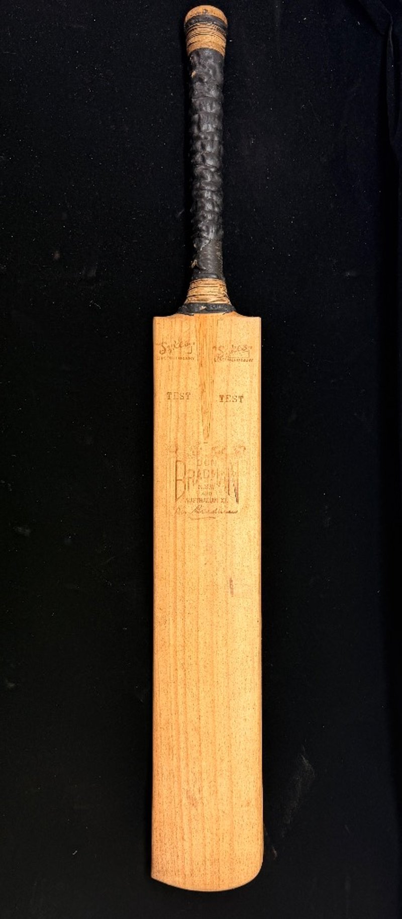 A Sykes, Don Bradman Test cricket bat, match-used by Bradman during his record-breaking 1930 Ashes series, and signed by him in the ownership position, upper right reverse. Bradman has restrung both the top and bottom of the handle, not so unusual considering over 500 runs was scored with this blade.