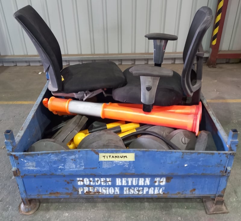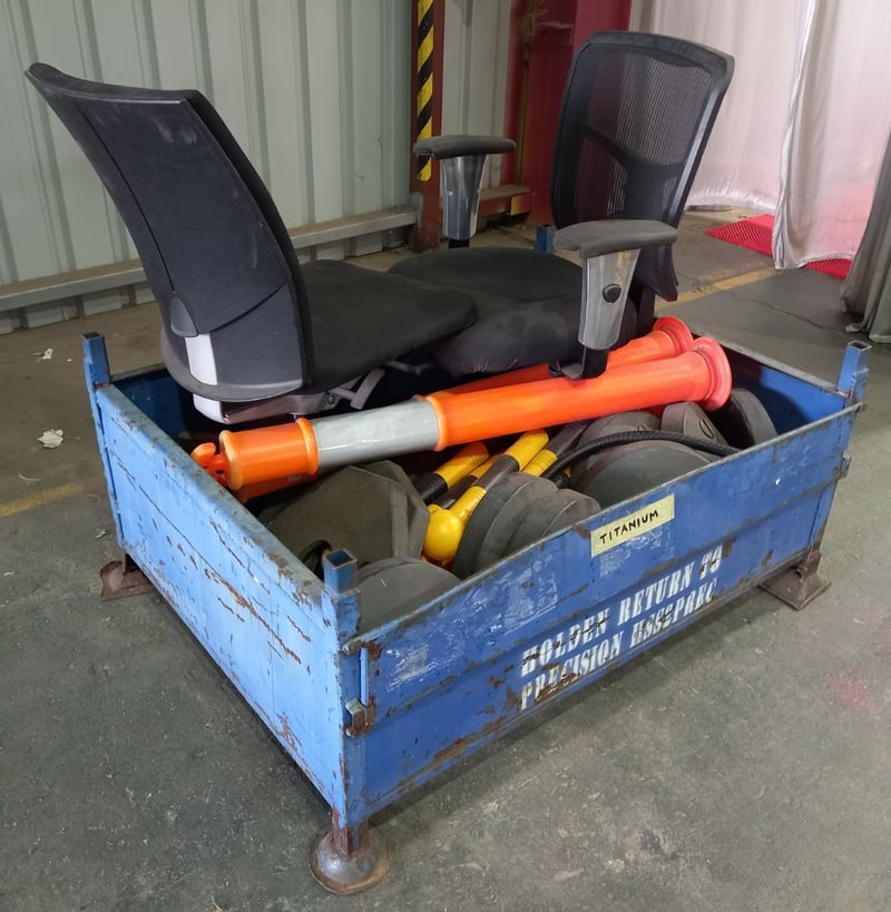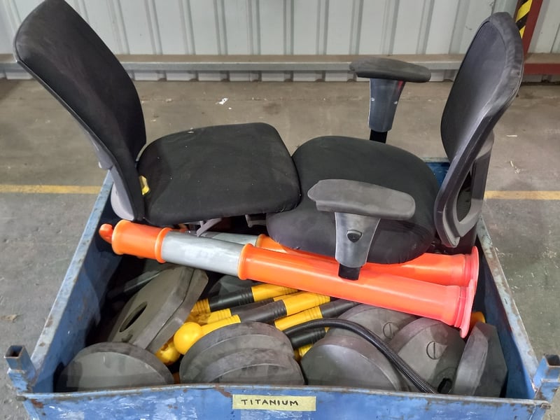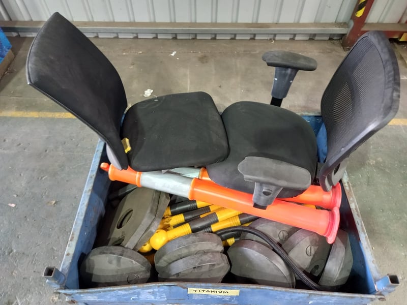 Hardware, Including Blue industrial Stillage, 2x Office chairs, and more