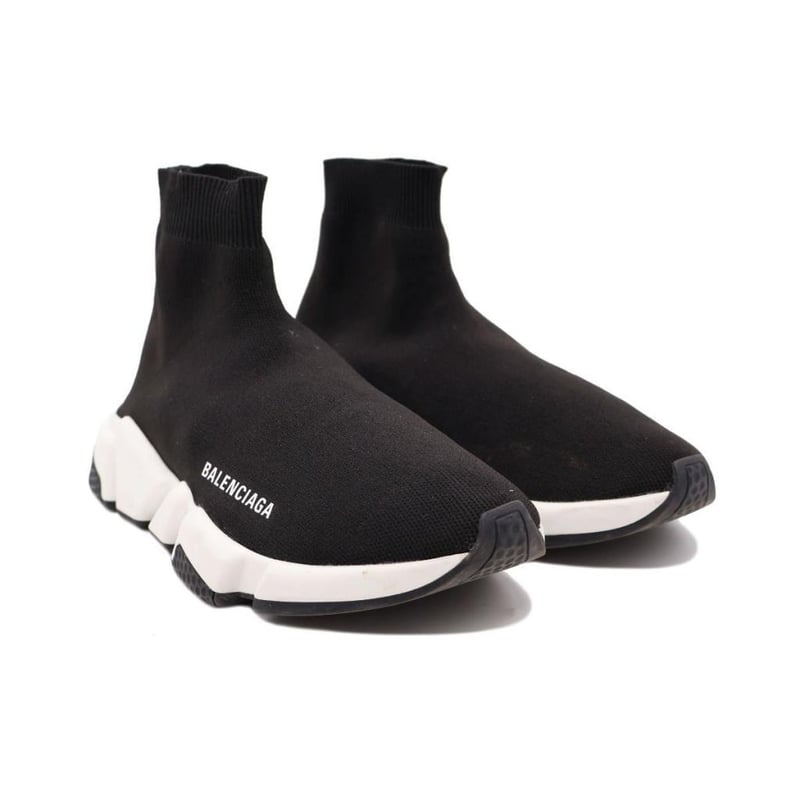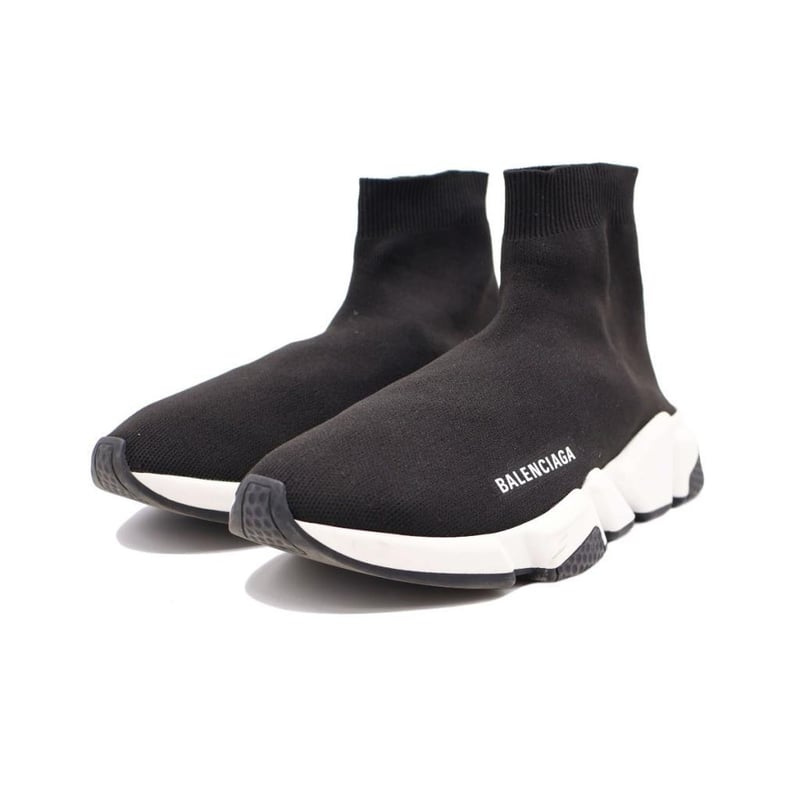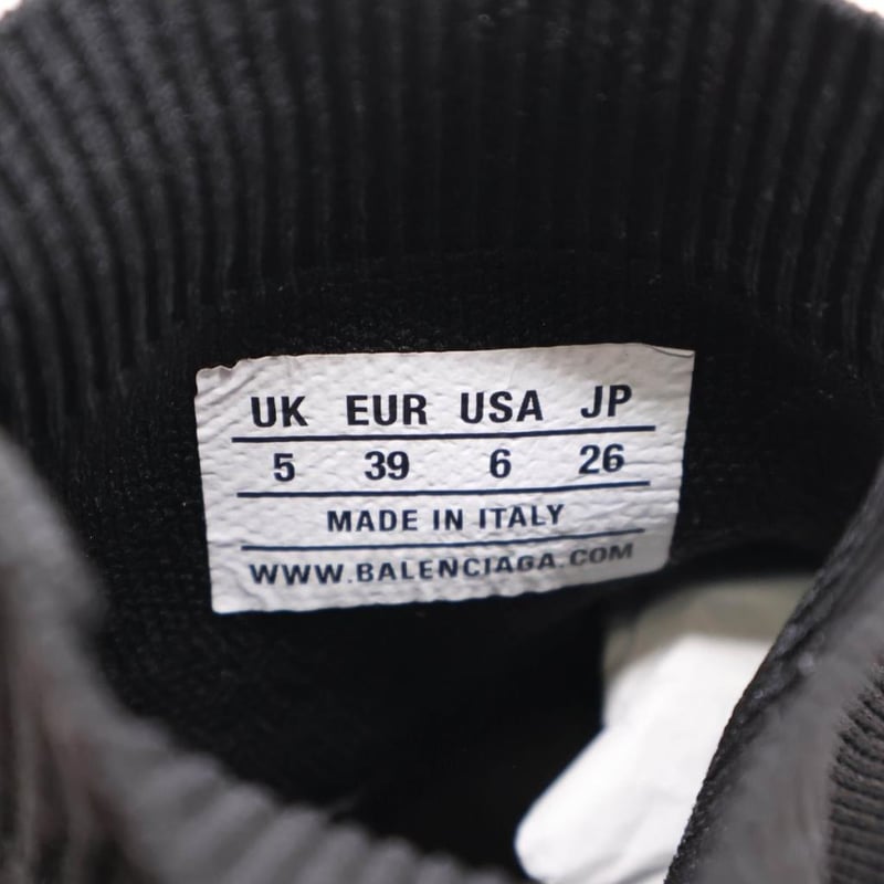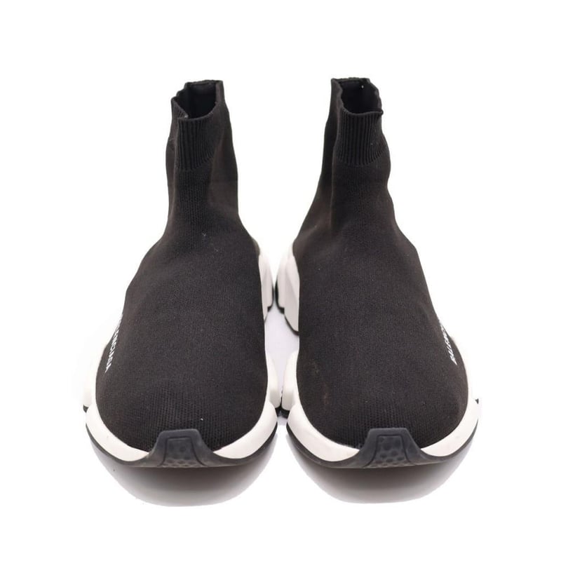 BALENCIAGA BLACK KNIT FABRIC SPEED TRAINER SOCK HIGH TOP SNEAKERS SIZE 39 Size: 39 Material Knit fabric with rubber soles. Additional Condition Report - Moderate sign of wear and tears on exterior - Moderate scuffs on soles Comes With - Original Box - Certificate of Authenticity CROSS DOCKED 162802+12