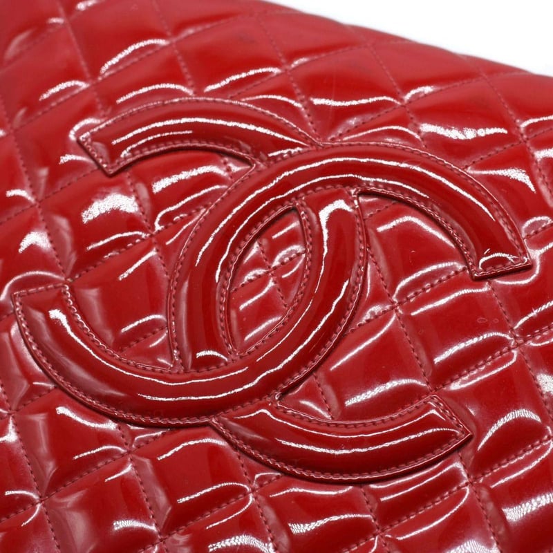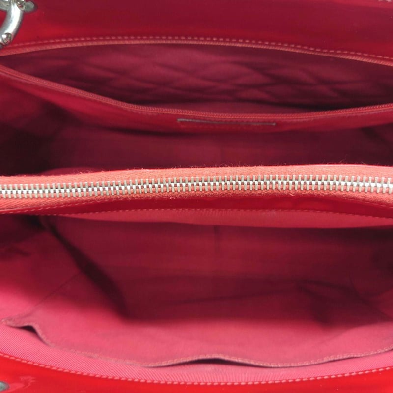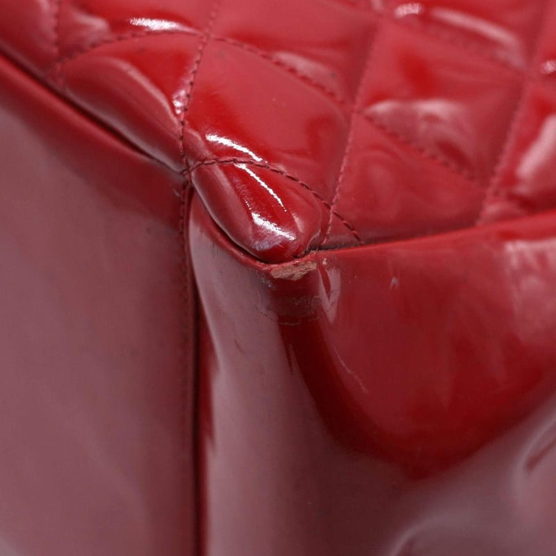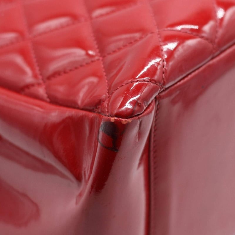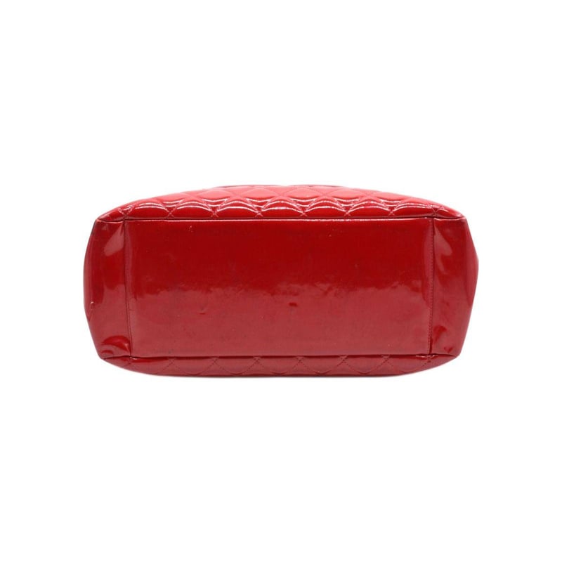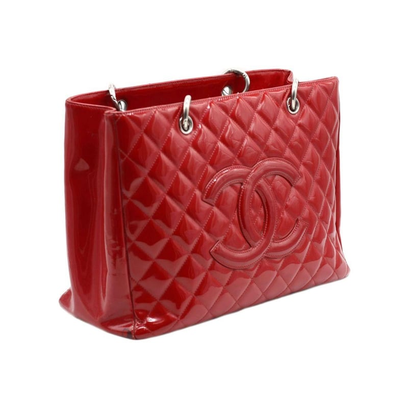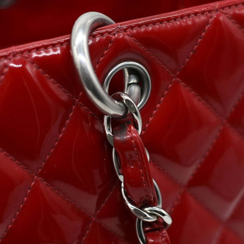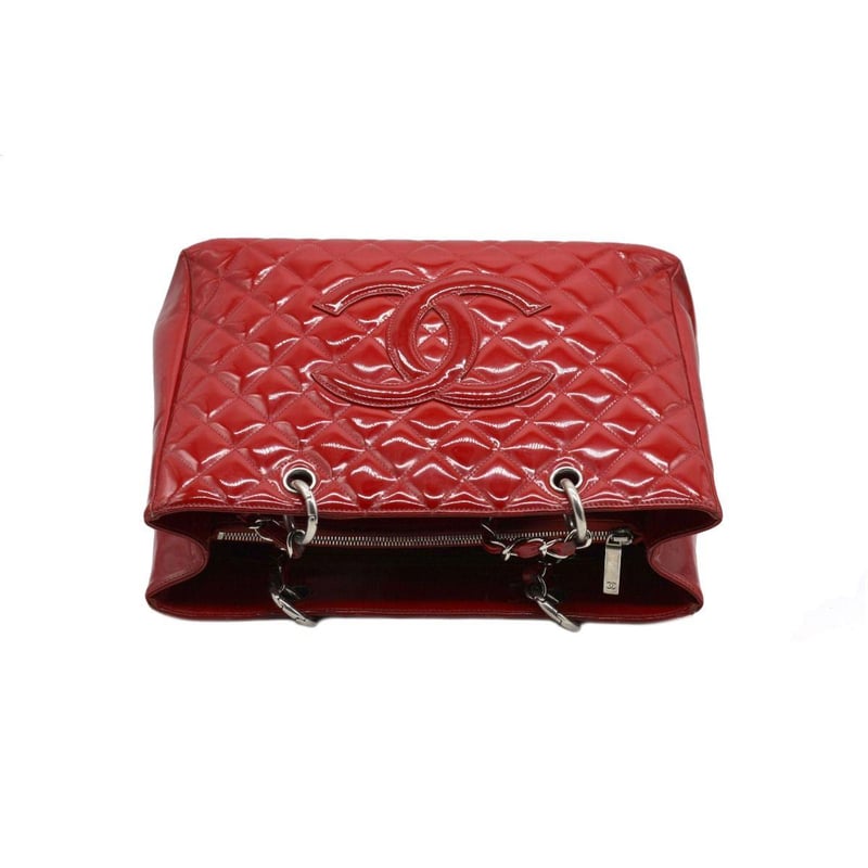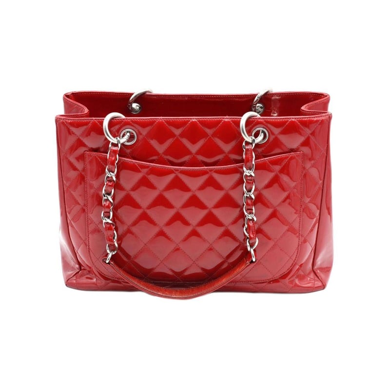 CHANEL RED PATENT LEATHER GST TOTE Length: 36cm Height: 24.5cm Depth: 15cm Handle Drop: 24cm Exterior Material Patent leather with silver-tone hardware, dual top handles and a rear patch pocket. Interior Material Textile lining with two main open compartments, a middle zipped compartment, a zipped pocket and a patch pocket. Additional Condition Report - Moderate sign of wear, tears and stains on exterior - Moderate scuffs on exterior corners - Moderate wear in interior - Moderate scratches on hardware Comes With - Authenticity Card - Certificate of Authenticity CROSSED DOCKED 155429+80