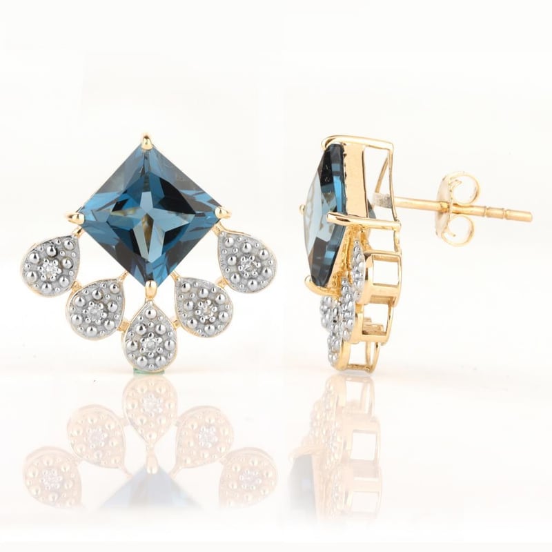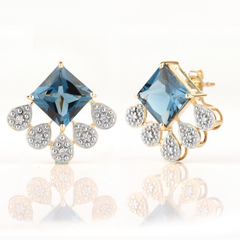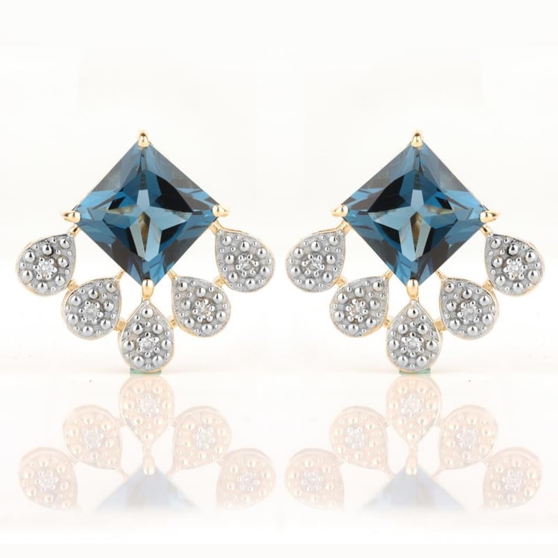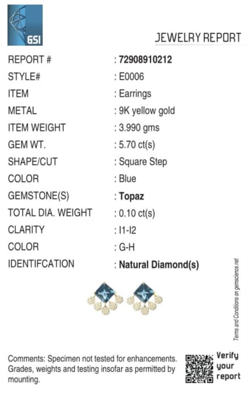 9CT YELLOW GOLD NATURAL LONDON BLUE TOPAZ & DIAMOND EARRINGS Weight Of The Item: 3.99 GFineness Of Metal(S): Yellow Gold 9KtThe Earrings Consists Of (2) Square Brilliant Natural London Blue Topaz. Surrounding The Main Stones Are Round Brilliant Cut Natural Diamonds.Identification: Natural London Blue TopazColor: BlueShape: Square Brilliant CutNo. Of Stone: 2Dimension: 8 Mm X 8 Mm X 4.8 MmWeight: 5.7 CaratsCut: Very GoodIdentification: Natural DiamondShape: Round Brilliant CutWeight: 0.1 CtsCertificates Are Provided By Gemological Science International (Gsi), An Independent Third-Party Gemological Laboratory Based In The Usa And Recognised Among The Top 10 Gem Labs Globally Condition: Good - Refer Images 0160841+37