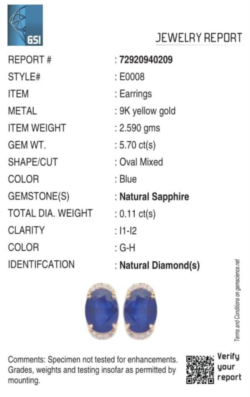 9CT YELLOW GOLD NATURAL BLUE SAPPHIRE & DIAMOND EARRINGS Weight Of The Item: 2.59 GFineness Of Metal(S): Yellow Gold 9KtThe Earrings Consists Of (2) Oval Brilliant Natural Blue Sapphire. Surrounding The Main Stones Are Round Brilliant Cut Natural Diamonds.Identification: Natural Blue SapphireColor: BlueShape: Oval Brilliant CutNo. Of Stone: 2Dimension: 9 Mm X 7 Mm X 5.4 MmWeight: 5.7 CaratsCut: Very GoodIdentification: Natural DiamondShape: Round Brilliant CutWeight: 0.11 CtsCertificates Are Provided By Gemological Science International (Gsi), An Independent Third-Party Gemological Laboratory Based In The Usa And Recognised Among The Top 10 Gem Labs Globally Condition: Good - Refer Images 0160841+48