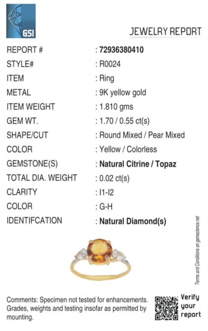 9CT YELLOW GOLD NATURAL CITRINE & DIAMOND RING Weight Of The Item: 1.81 GFineness Of Metal(S): Yellow Gold 9KtThe Ring Consists Of (1) Round Brilliant Natural Citrine & (2) Round Brilliant Cut White Topaz. Surrounding The Main Stones Are Round Brilliant Cut Natural Diamonds.Ring Size: Us 7Identification: Natural Citrine / Natural White TopazColor: Yellow / WhiteShape: Round Brilliant Cut / Pear Faceted CutNo. Of Stone: 3Dimension: 8 Mm X 8 Mm X 4.8 MmWeight: 1.7 Carats / 0.55 CaratsCut: Very GoodIdentification: Natural DiamondShape: Round Brilliant CutWeight: 0.02 CtsCertificates Are Provided By Gemological Science International (Gsi), An Independent Third-Party Gemological Laboratory Based In The Usa And Recognised Among The Top 10 Gem Labs Globally Condition: Good - Refer Images 0160841+120