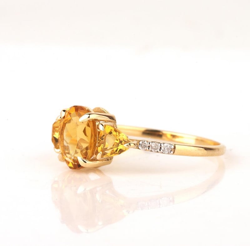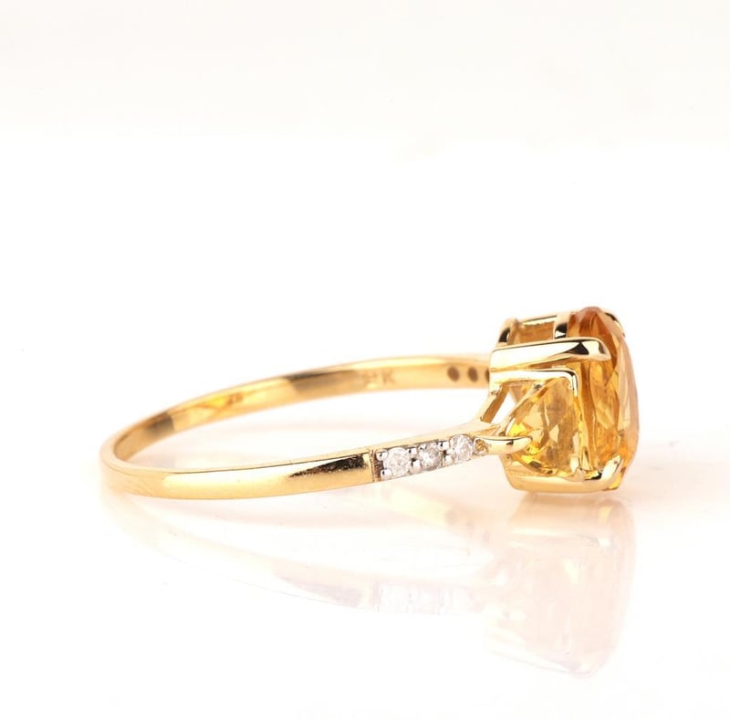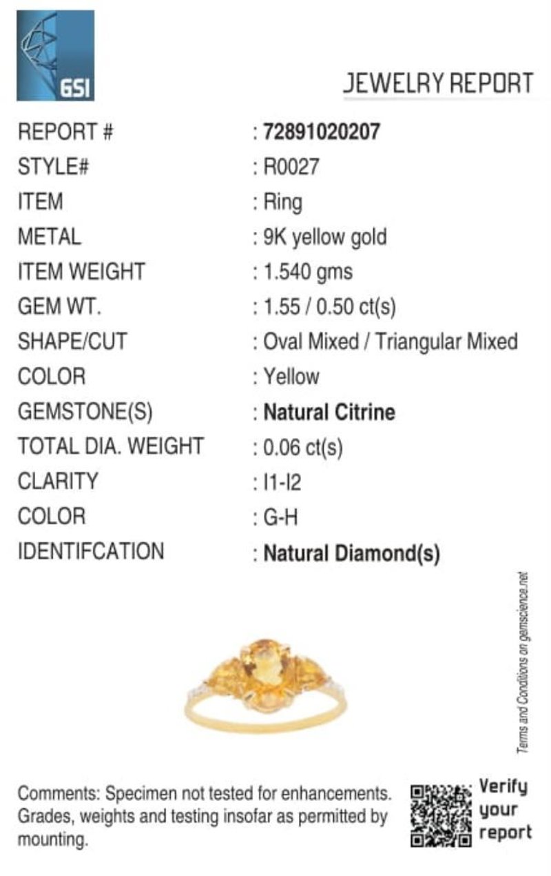 9CT YELLOW GOLD NATURAL CITRINE & DIAMOND RING Weight Of The Item: 1.54 GFineness Of Metal(S): Yellow Gold 9KtThe Ring Consists Of (1) Oval Brilliant Natural Citrine & (2) Round Brilliant Cut Citrine. Surrounding The Main Stones Are Round Brilliant Cut Natural Diamonds.Ring Size: Us 7Identification: Natural Citrine / Natural CitrineColor: Yellow / YellowShape: Oval Brilliant Cut / Trillion Faceted CutNo. Of Stone: 3Dimension: 8 Mm X 6 Mm X 4.8 MmWeight: 1.55 Carats / 0.5 CaratsCut: Very GoodIdentification: Natural DiamondShape: Round Brilliant CutWeight: 0.06 CtsCertificates Are Provided By Gemological Science International (Gsi), An Independent Third-Party Gemological Laboratory Based In The Usa And Recognised Among The Top 10 Gem Labs Globally Condition: Good - Refer Images 0160841+139