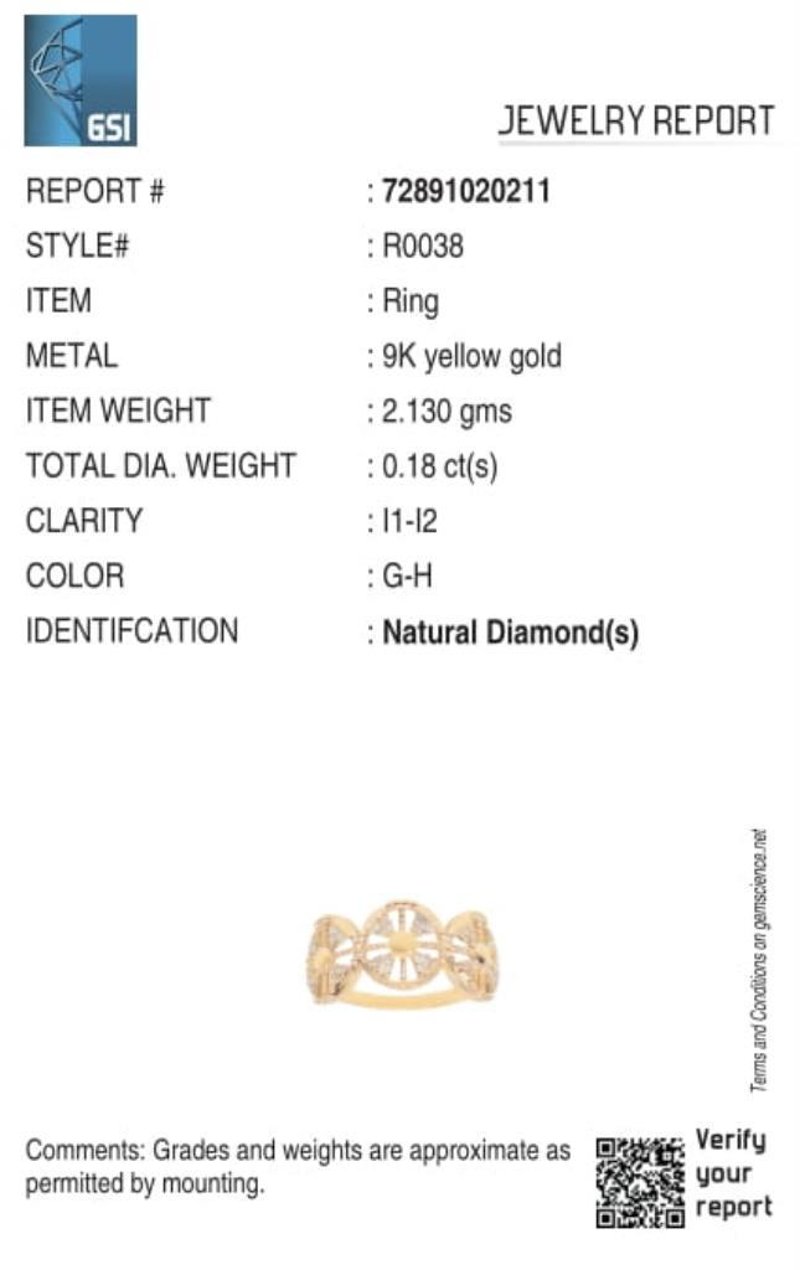 9CT YELLOW GOLD NATURAL DIAMOND & DIAMOND RING Weight Of The Item: 2.13 GFineness Of Metal(S): Yellow Gold 9KtThe Ring Consists Of () Natural Diamond. Surrounding The Main Stones Are Round Brilliant Cut Natural Diamonds.Ring Size: Us 7Identification: Natural DiamondColor: WhiteShape: CutNo. Of Stone: 0Dimension: Mm X Mm X 0 MmWeight: CaratsCut: Very GoodIdentification: Natural DiamondShape: Round Brilliant CutWeight: 0.18 CtsCertificates Are Provided By Gemological Science International (Gsi), An Independent Third-Party Gemological Laboratory Based In The Usa And Recognised Among The Top 10 Gem Labs Globally Condition: Good - Refer Images 0160841+179