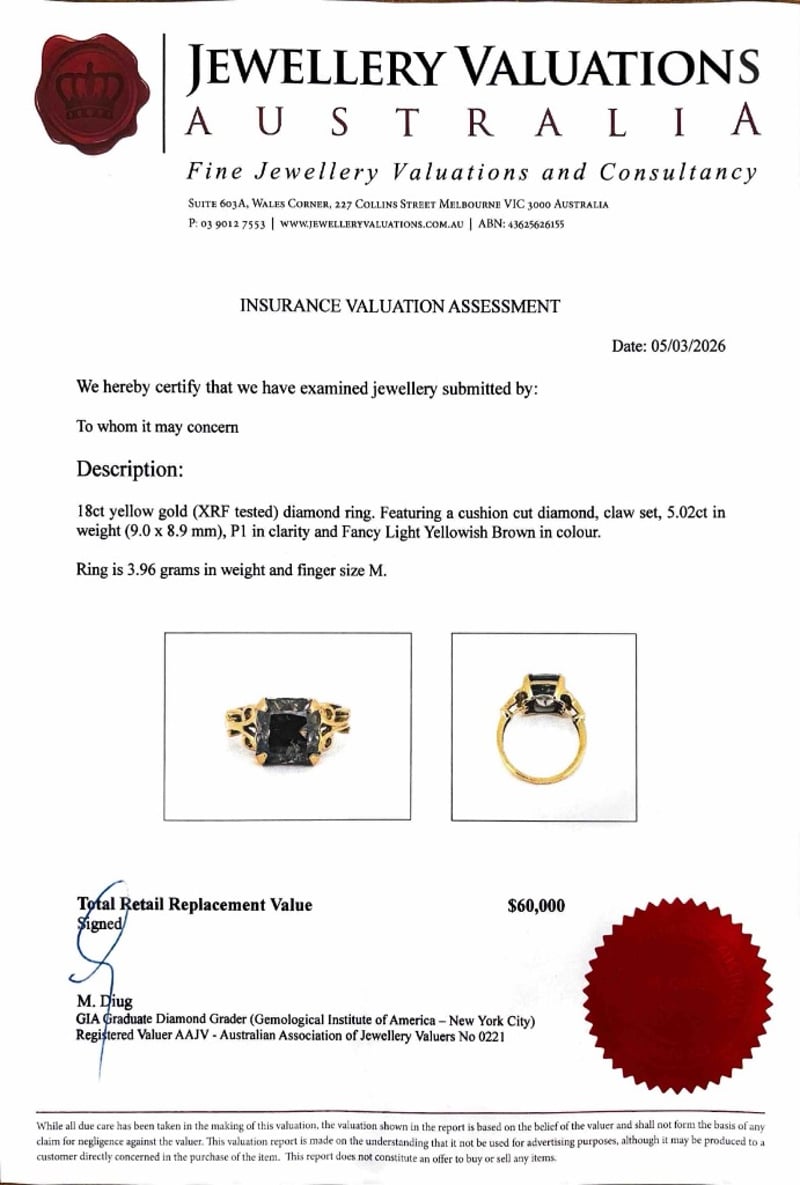 Featuring A Cushion Cut Diamond, Claw Set, 5.02Ct In Weight (9.0 X 8.9 Mm), P1 In Clarity And Fancy Light Yellowish Brown In Colour.