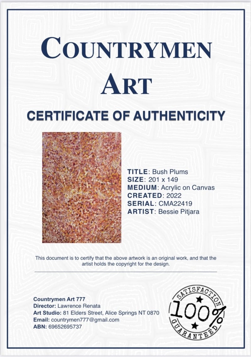 BESSIE PITIJARAAcrylic On CanvasTitle: Bush PlumsItem Size: Height: 201cm, Width: 149cmSignature Details: Signature On Back Of CanvasAccompanied By A Certificate Of AuthenticityCondition: Good - Refer To ImagesBeverley782508+1