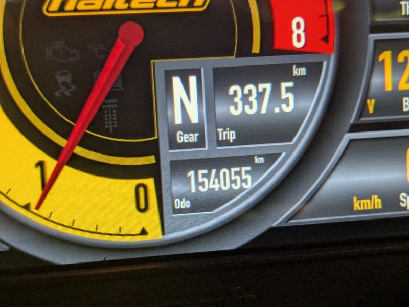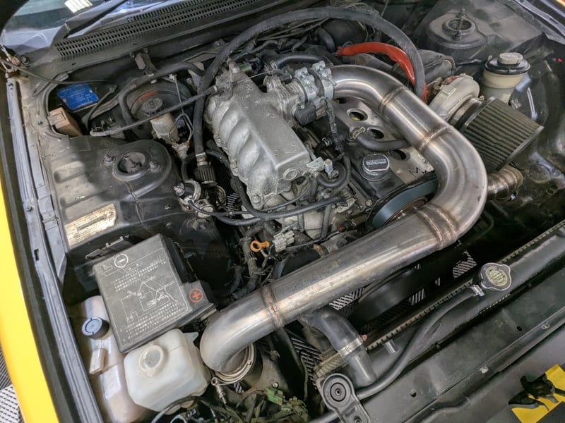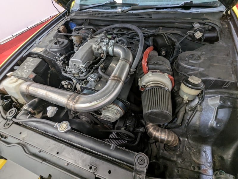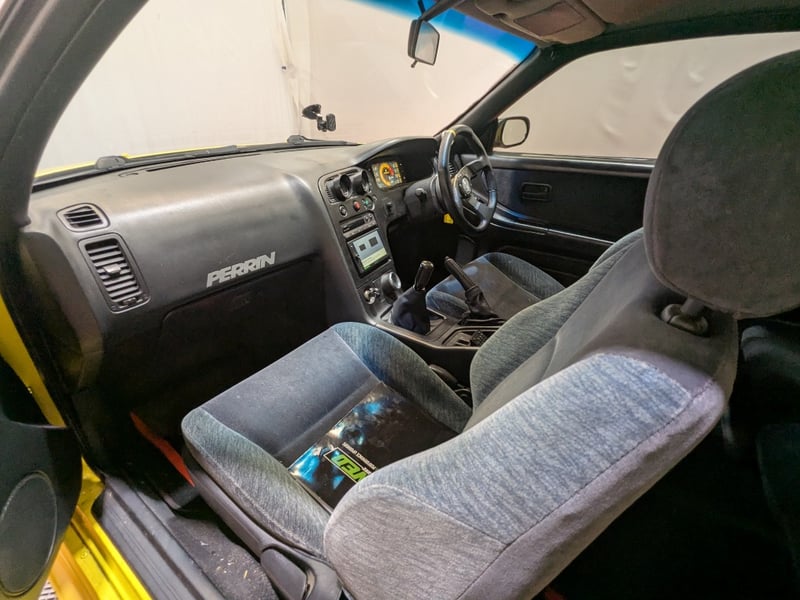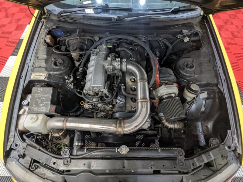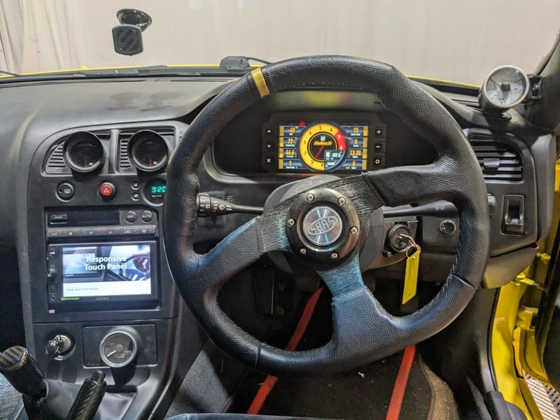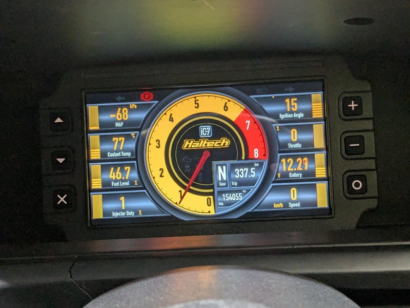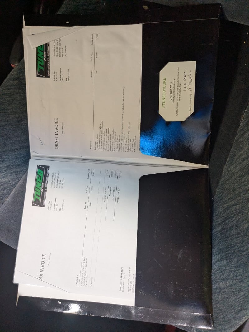 This example features extensive performance upgrades including a Kingawa GTX76 turbo, custom intercooler setup, 550cc injectors, upgraded fuel system, and heavy-duty clutch. Engine management has been converted to a Haltech Platinum Sport ECU with Haltech IC-7 digital dash, accompanied by tuning work that resulted in 414 rwhp at approximately 12 psi on 98 octane. Vendor notes receipts and invoices are supplied for the work carried out.