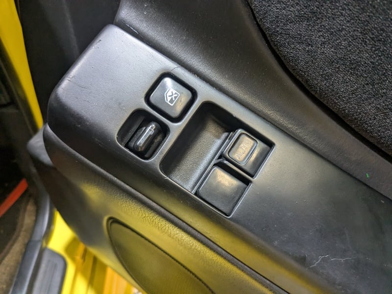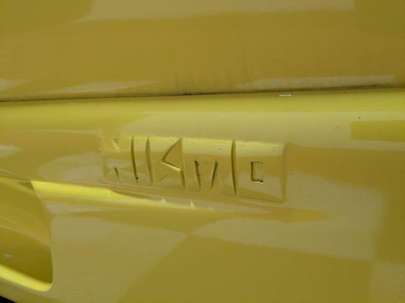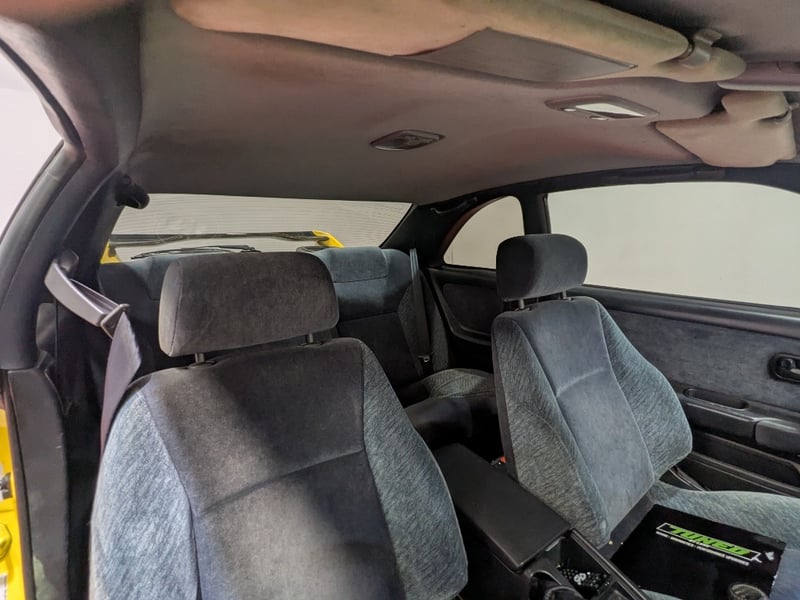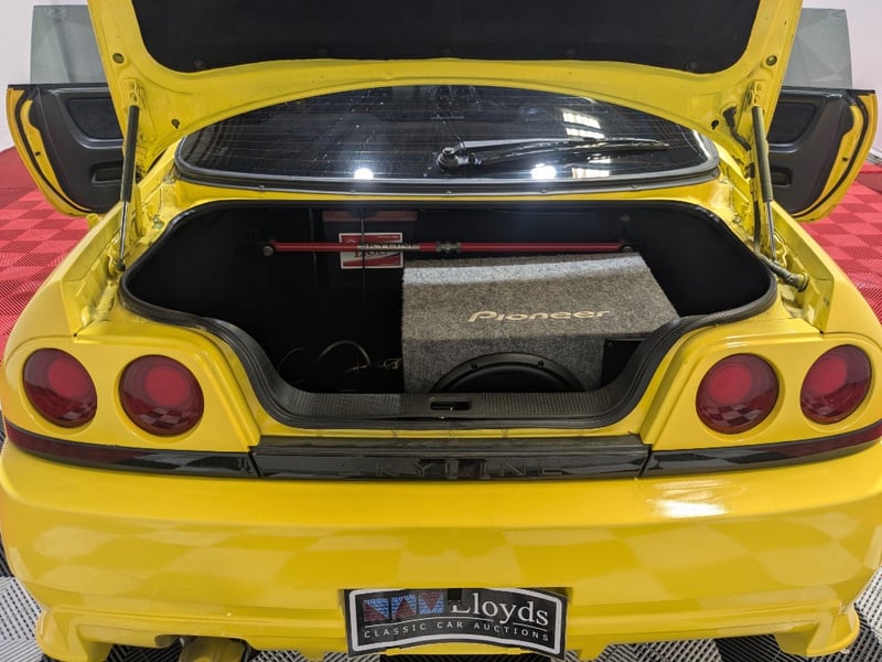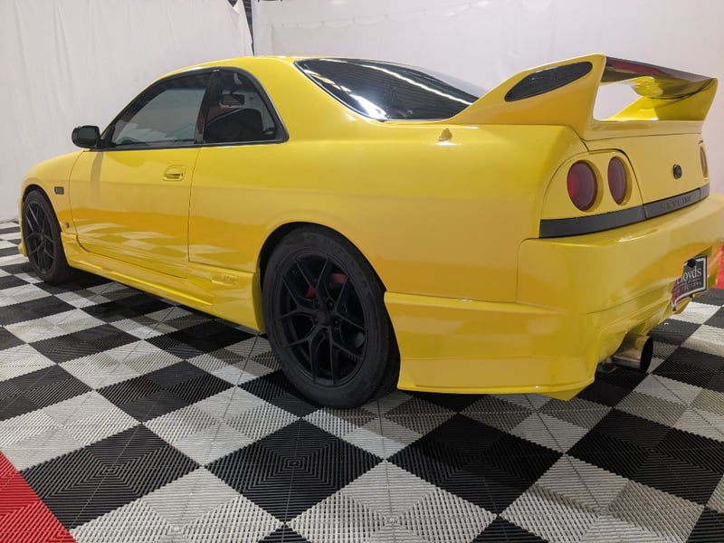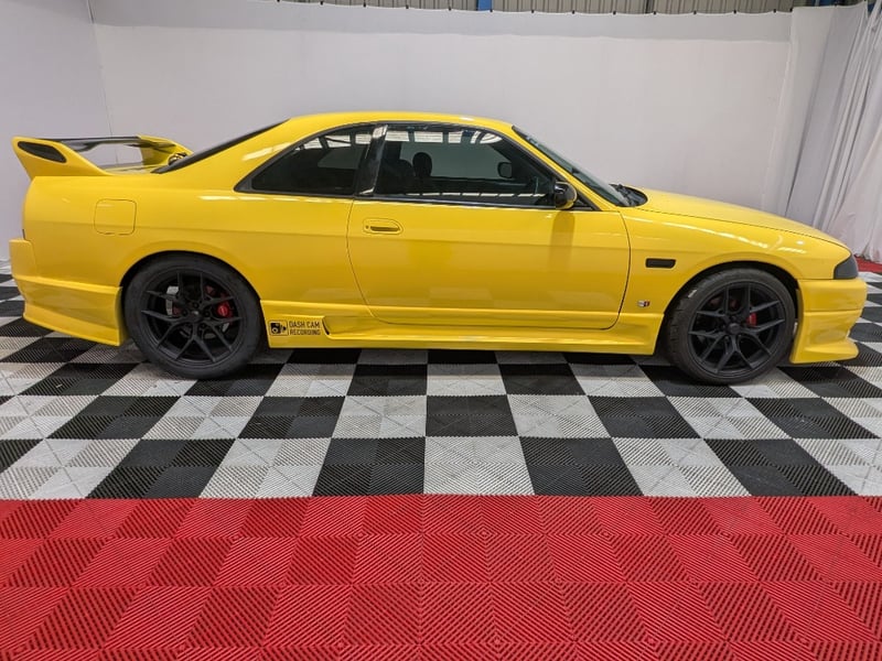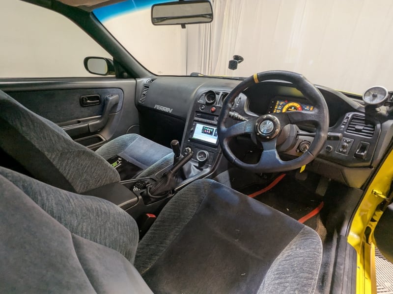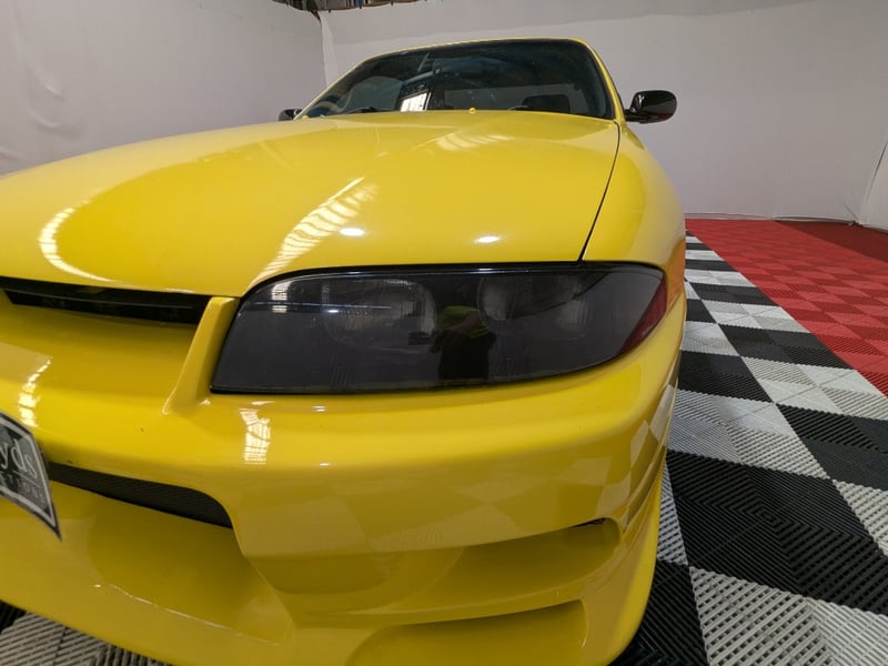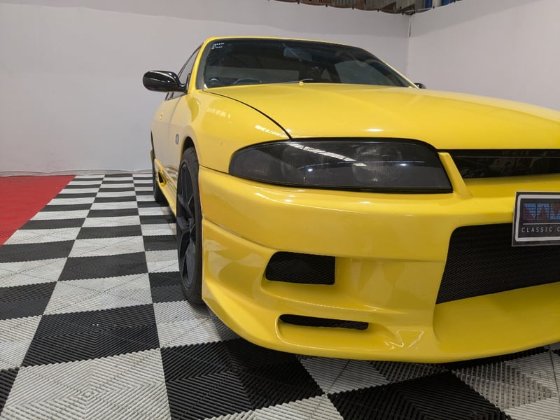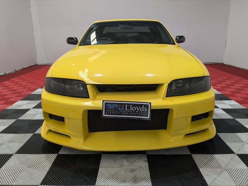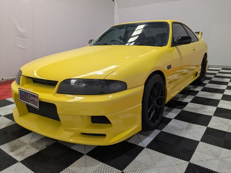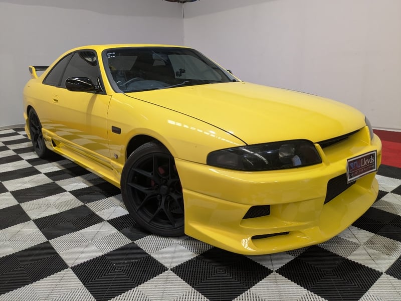 A modified R33 Skyline coupe finished in Yellow, showing an indicated 154,055 km and powered by a turbocharged 2.5-litre petrol engine paired with a 5-speed manual transmission.
