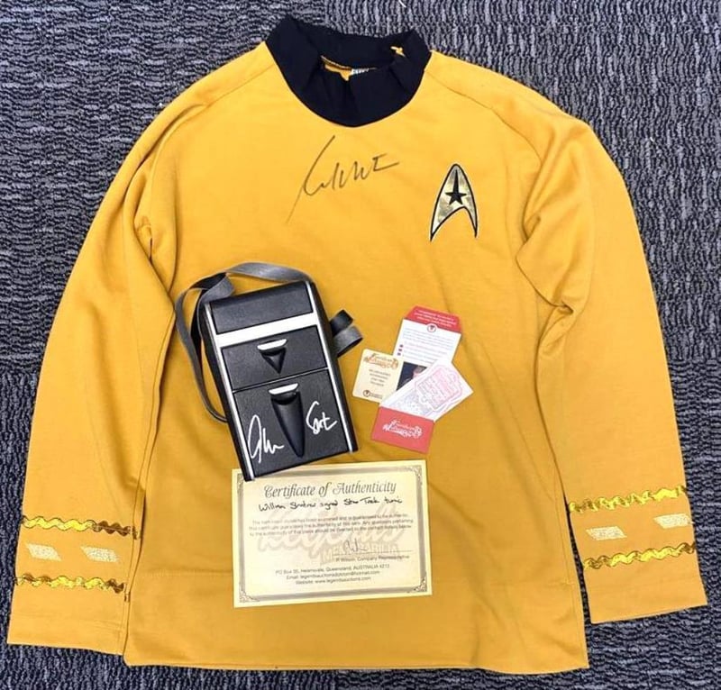 WILLIAM SHATNER AUTOGRAPHED STAR TREK TUNIC PLUS REPLICA TRICORDER COA Custom "Star Trek" Style Captains Uniform Hand Signed Beautifully In Sharpie By "Captain Kirk"; William Shatner With Coa Plus Classic Science Tricorder. Tricorder Has Been Personally Hand-Signed By Series Icon William Shatner During His Autograph Signing With Celebrity Authentics. No Landing Party Is Complete Without A Tricorder To Take Readings. The Top Pops Up To Lights And Sounds (Straight From The Tv Show) With Three Buttons To Activate The Sound/Light Effects. The First Door Opens Down To Expose The "Data Disks" And A Rotating Moiré Pattern. The Second Door Opens To Reveal A Hidden Compartment And A Removable Hand Scanner (With Its Own Light Effects). Ships Affixed With Celebrity Authentics Serial-Numbered And Tamper Evident Authentication Hologram And Includes Celebrity Authentics Certificate Of Authenticity Featuring Picture Of Mr. Shatner Signing Tricorder. CROSS DOCK 155544+43