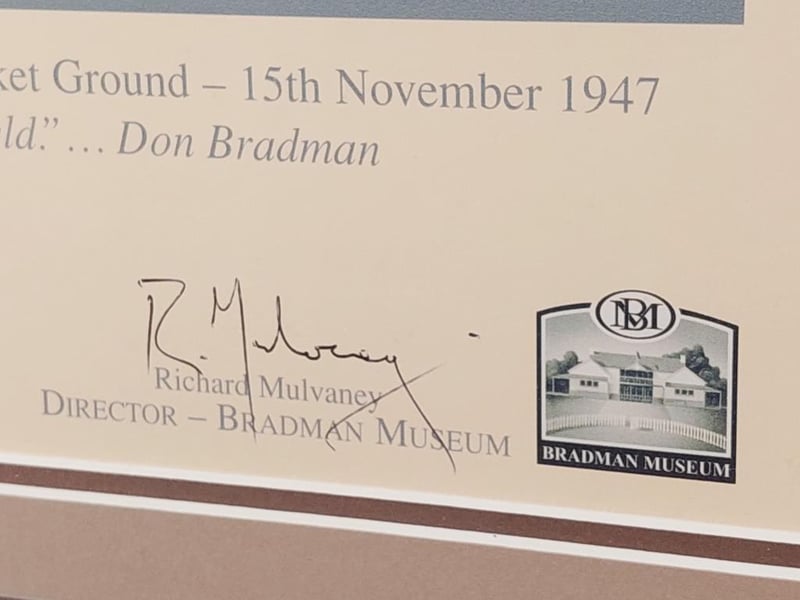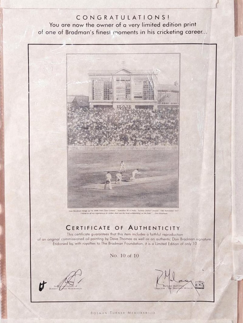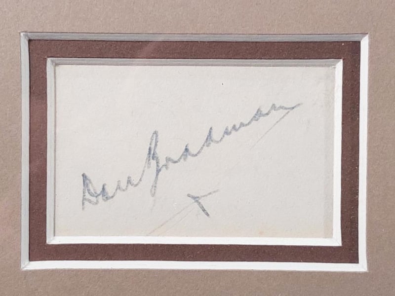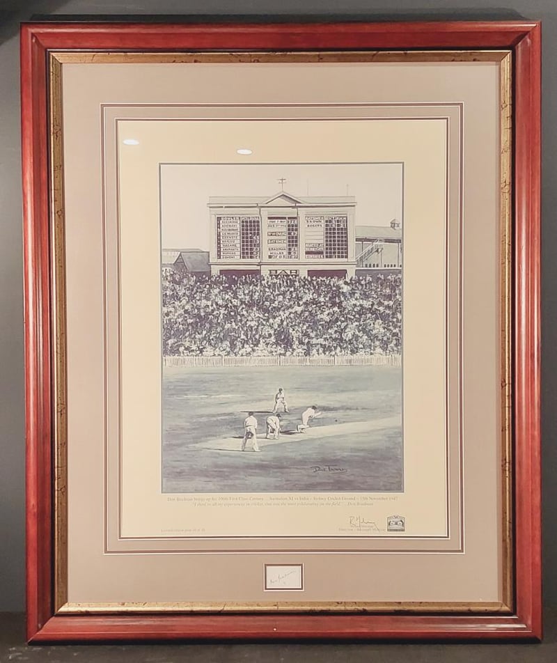 SIR DONALD BRADMAN LIMITED EDITION HANDSIGNED CARD WITH REPRODUCTION PRINT IN FRAMED DISPLAY Limited Edition 10/10 Comes With Certificate Of Authenticity From Bosman Memorabilia And Investments Size: 108cm x 90cm x 5cm Condition: Excellent - Refer To Images 155566+58