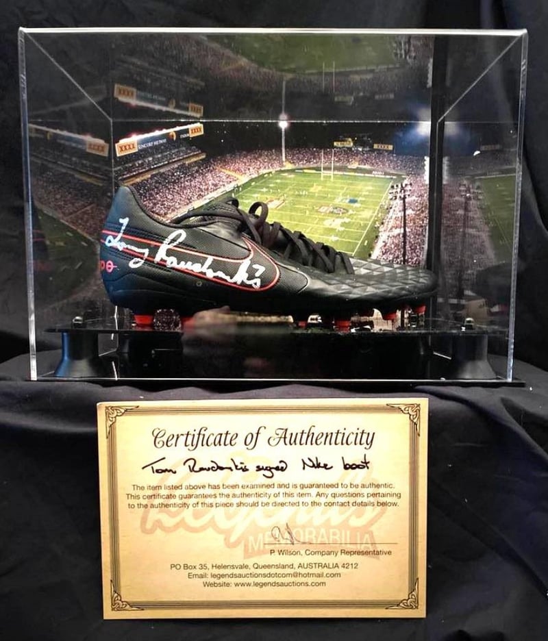 TOMMY RAUDONIKIS CASED SIGNED BOOT COAThomas Walter Raudonikis Oam (13 April 1950[5] – 7 April 2021) Was An Australian Rugby League Footballer And Coach. He Played 40 International Games And World Cup Games As Australia Representative Halfback And Captained His Country In Two Matches Of The 1973 Kangaroo Tour.CROSS DOCK155544+61
