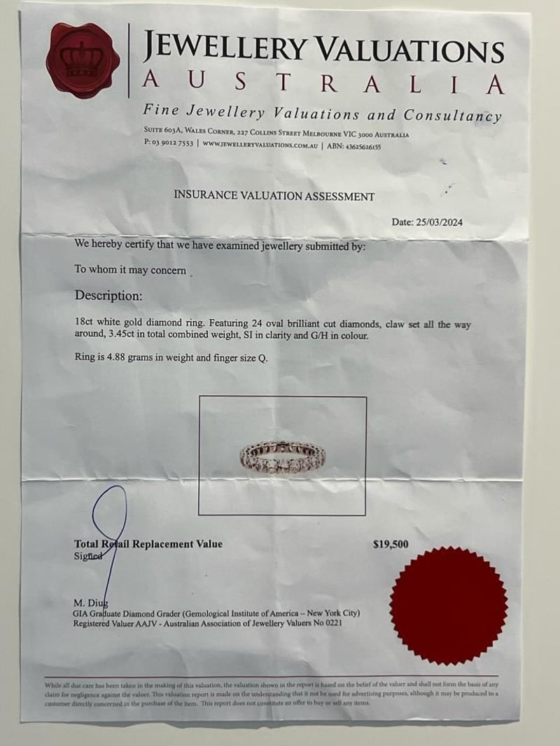 An Exquisite 18Ct White Gold Diamond Eternity Ring, Featuring 24 Oval Brilliant-Cut Diamonds Meticulously Claw-Set In A Continuous Design. These Dazzling Diamonds Have A Total Combined Weight Of 3.45Ct, Graded Si Clarity And G/H Colour, Ensuring Exceptional Brilliance And Fire.