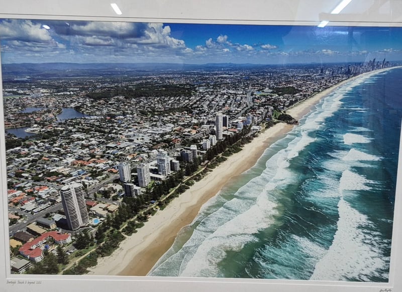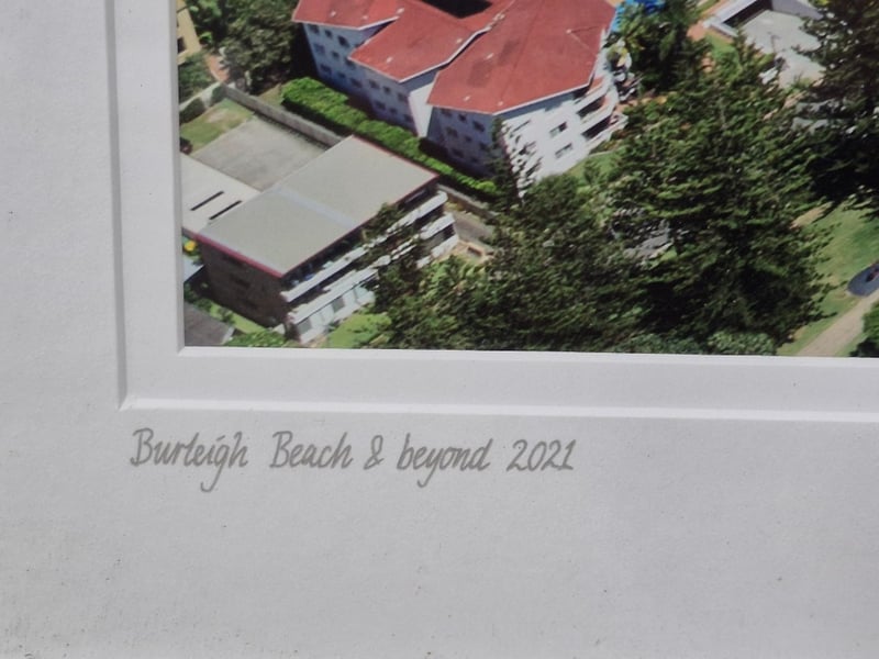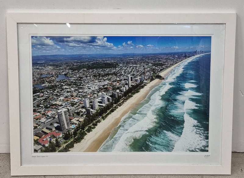 SIGNED AERIAL PHOTOGRAPH OF BURLEIGH BEACH 2021 BY GUY MURPHYItem Size: Height: 69cm, Width: 94cm, Depth: 2cm, Weight: 1KgCondition: Good - Refer To Images4A586345+2
