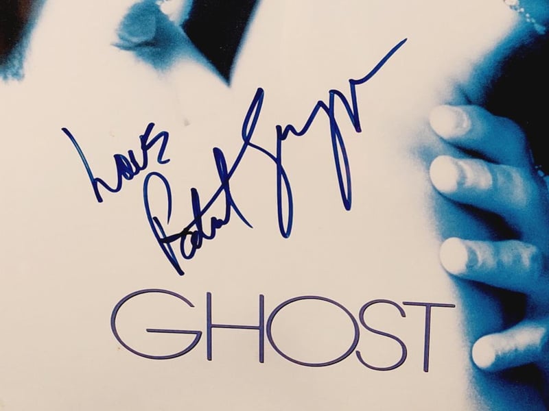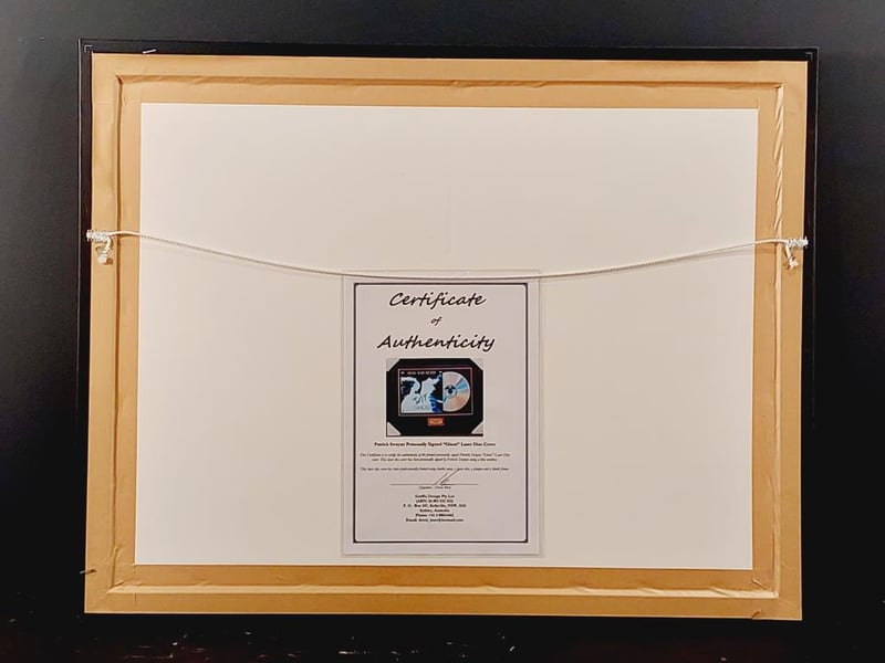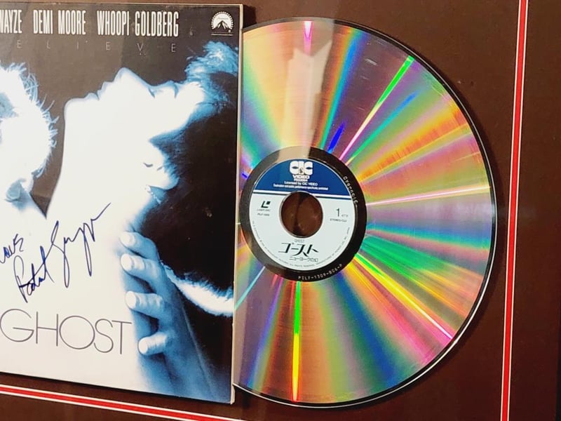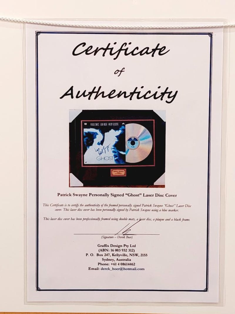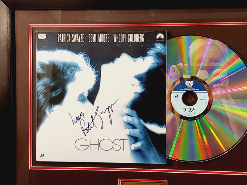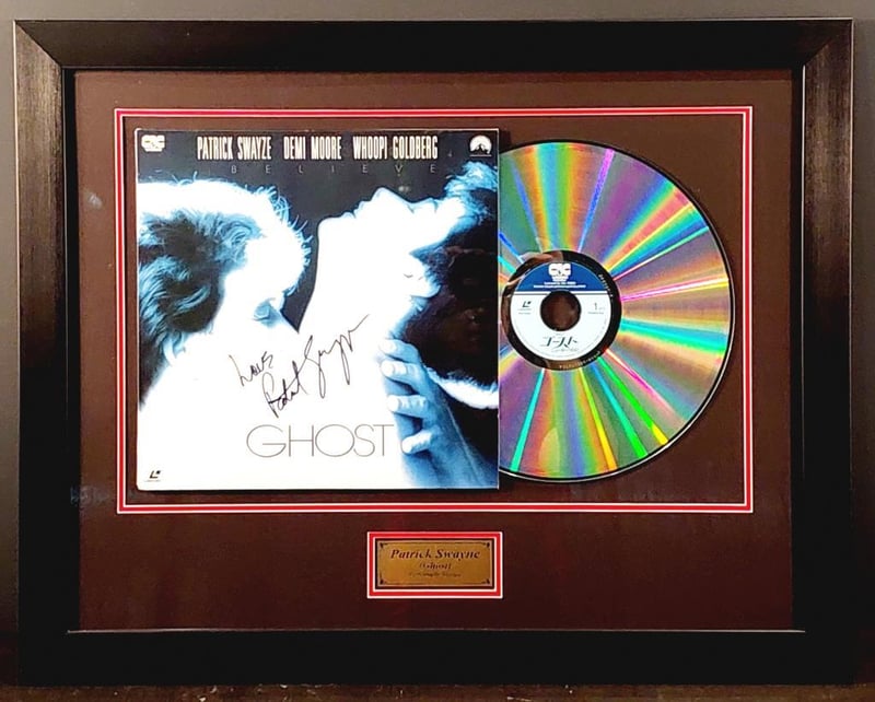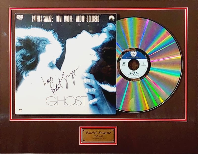 PATRICK SWAYZE HANDSIGNED "GHOST" LASERDISC COVER IN FRAMED DISPLAY Comes With Certificate Of Authenticity From Graffix Design Size: 58cm x 74cm x 3cm Condition: Excellent - Refer To Images 155566+33