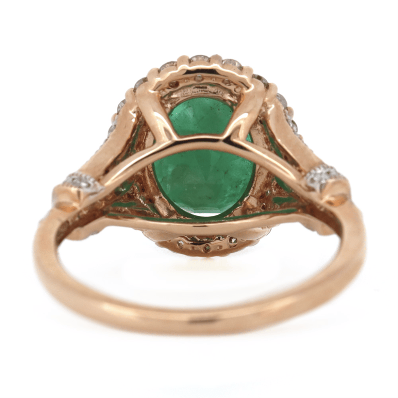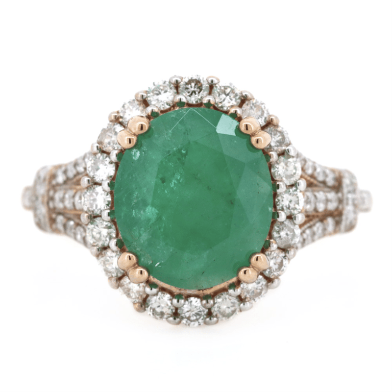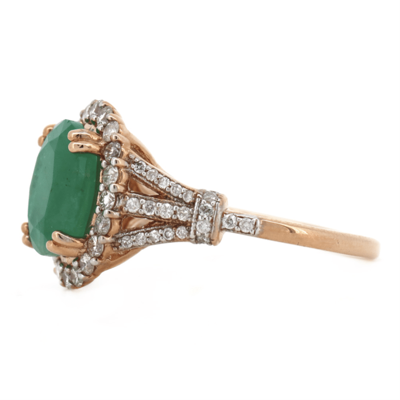 14K ROSE GOLD, EMERALD AND DIAMOND, HALO RING. The Centre Features, One Oval Cut, Medium Bluish-Green, Emerald (3.18Ct, Included), Double 4 Claw Set. Surrounding The Centre In A Halo And Decorating The Band Are, 64 Round Brilliant Cut, Diamonds (0.68Ct Tdw, J-K Colour, Si2-I2 Clarity), Bead/Micro-Claw Set In White Gold With Millegrain Detail. Ring Size O 1/2. Valuations Provided by an Independent Third-Party Professional Not Directly Associated With Lloyds Auctions at AUD $$13,450.00This valuation has been conducted by an independent third-party professional. The valuation amount is an assessment by the issuing valuer and does not reflect the auction value of the item. Any inquiries regarding the valuation should be directed to the issuing valuer (refer to contact details on the certificate), as Lloyds Auctions has no affiliation or influence over the valuation, the valuer, or the stated amount. Condition: Good - Refer Images 0645909+1621