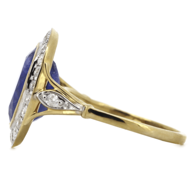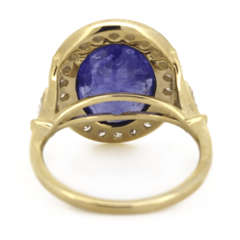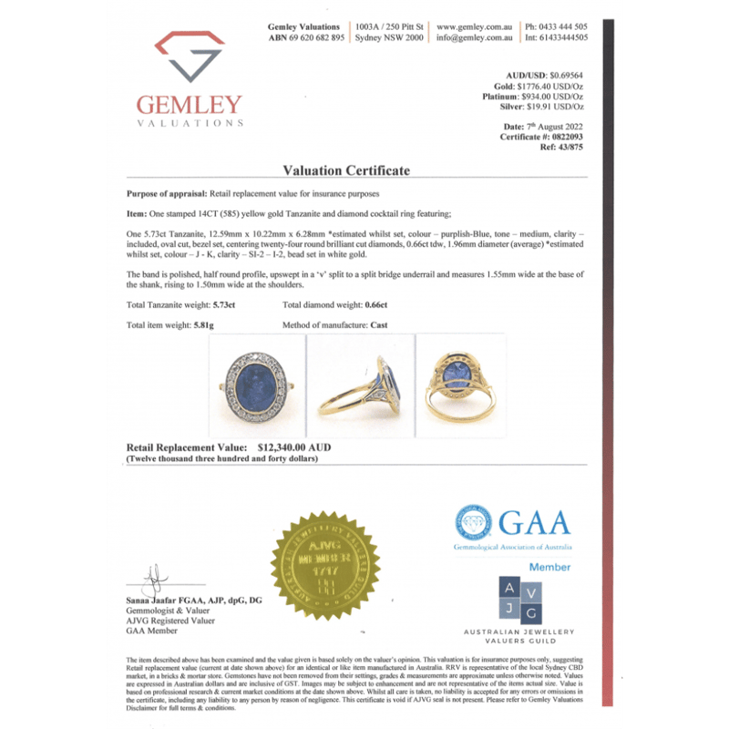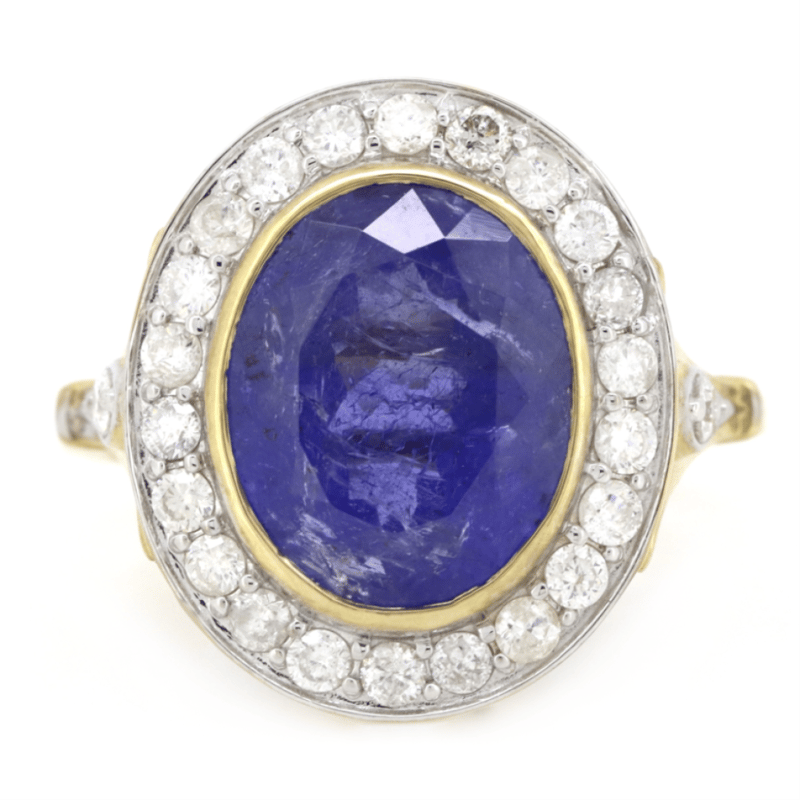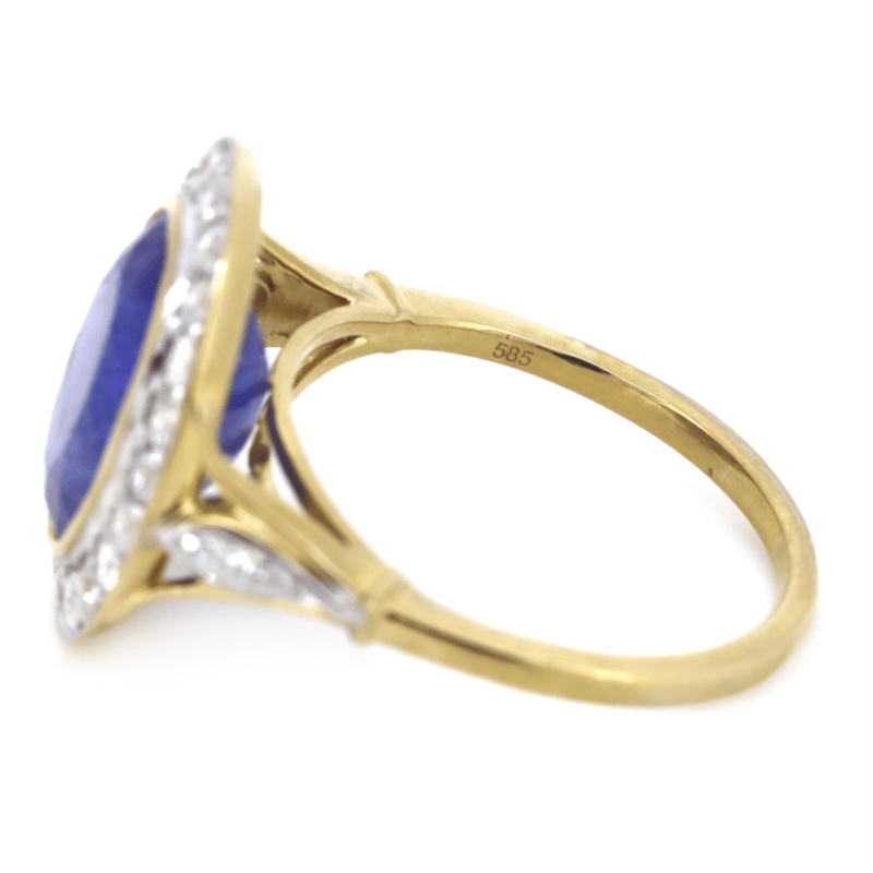 14K YELLOW GOLD, TANZANITE AND DIAMOND, HALO RING. The Centre Features, One Oval Cut, Medium Purplish-Blue, Tanzanite (5.73Ct, Included), Bezel Set. Surrounding The Centre In A Halo And Decorating The Shoulders Are, 24 Round Brilliant Cut, Diamonds (0.66Ct Tdw, J-K Colour, Si2-I2 Clarity), Bead Set In White Gold. Ring Size P. Valuations Provided by an Independent Third-Party Professional Not Directly Associated With Lloyds Auctions at AUD $$12,340.00This valuation has been conducted by an independent third-party professional. The valuation amount is an assessment by the issuing valuer and does not reflect the auction value of the item. Any inquiries regarding the valuation should be directed to the issuing valuer (refer to contact details on the certificate), as Lloyds Auctions has no affiliation or influence over the valuation, the valuer, or the stated amount. Condition: Good - Refer Images 0645909+1624