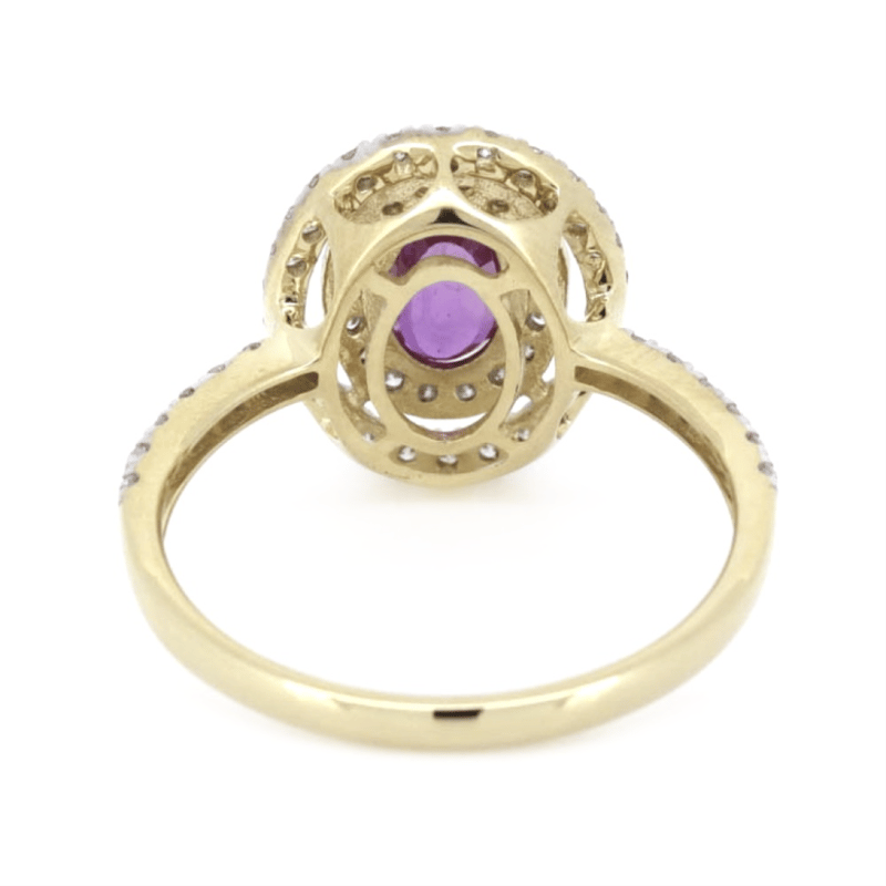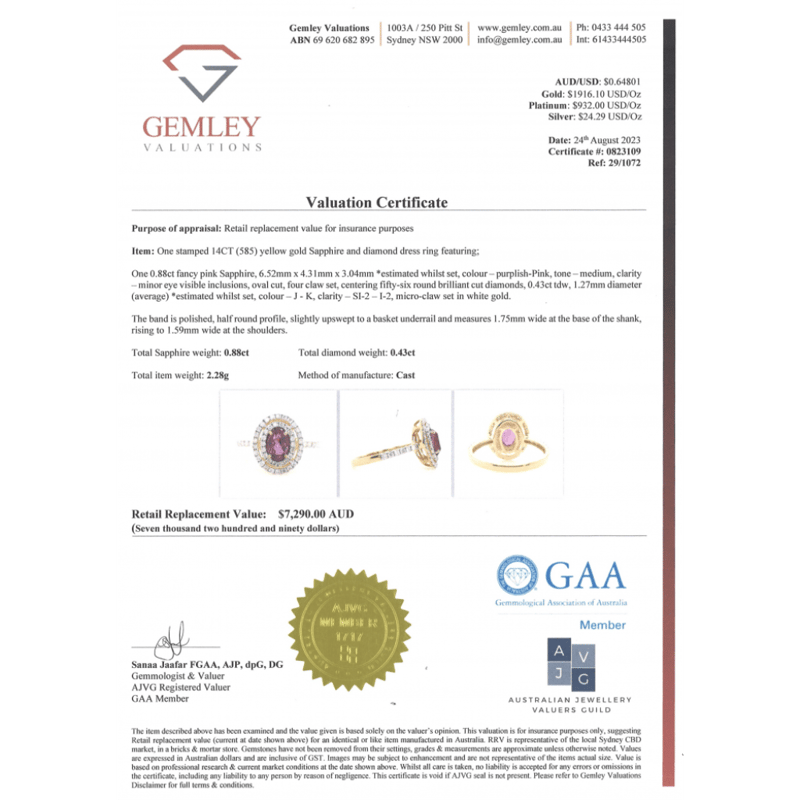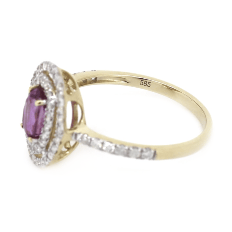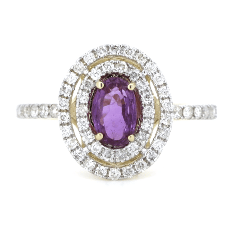 14K YELLOW GOLD, PINK SAPPHIRE AND DIAMOND, DOUBLE HALO RING. The Centre Features, One Oval Cut, Medium Purplish-Pink, Sapphire (0.88Ct, Minor Eye Visible Inclusions), 4 Claw Set. Surrounding The Centre In A Double Halo And Decorating The Band Are, 56 Round Brilliant Cut, Diamonds (0.43Ct Tdw, J-K Colour, Si2-I2 Clarity), Micro-Claw Set In White Gold. Ring Size N. Valuations Provided by an Independent Third-Party Professional Not Directly Associated With Lloyds Auctions at AUD $$7,290.00This valuation has been conducted by an independent third-party professional. The valuation amount is an assessment by the issuing valuer and does not reflect the auction value of the item. Any inquiries regarding the valuation should be directed to the issuing valuer (refer to contact details on the certificate), as Lloyds Auctions has no affiliation or influence over the valuation, the valuer, or the stated amount. Condition: Good - Refer Images 0645909+1628
