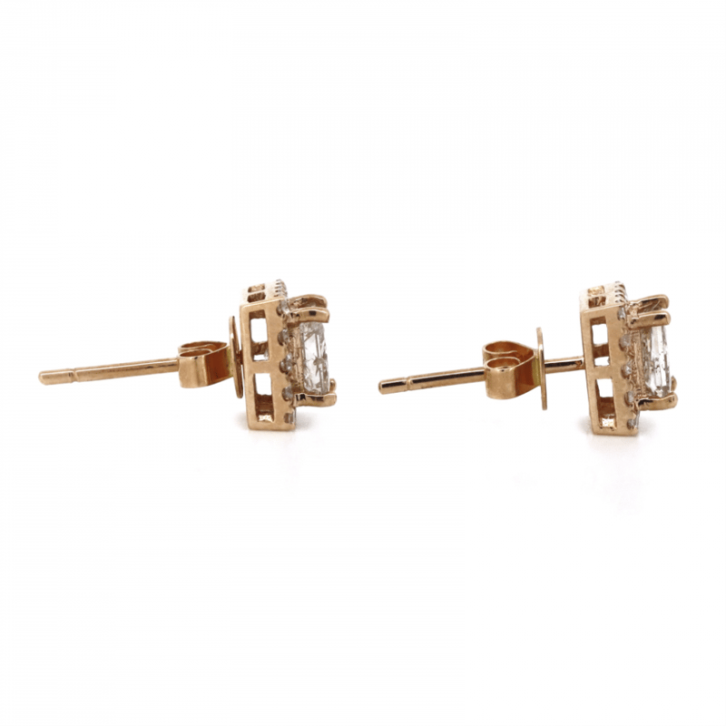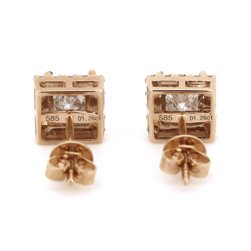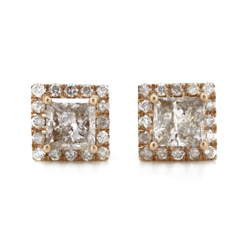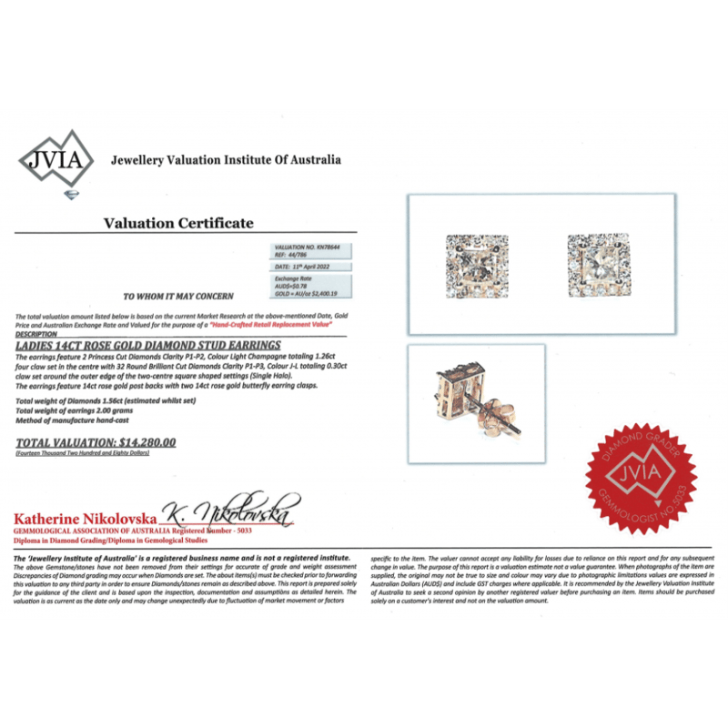 14K ROSE GOLD, CHAMPAGNE DIAMOND, HALO STUD EARRINGS. The Centres Feature, 2 Princess Cut, Light Champagne, Diamonds (1.26Ct Tdw, P1-P2 Clarity), 4 Claw Set. Surrounding The Centres In Halos Are, 32 Round Brilliant Cut, Diamonds (0.30Ct Tdw, J-L Colour, P1-P3 Clarity), Claw Set. The Earrings Have Post Backs With 14K Rose Gold Butterfly Clasps. Valuations Provided by an Independent Third-Party Professional Not Directly Associated With Lloyds Auctions at AUD $$14,280.00This valuation has been conducted by an independent third-party professional. The valuation amount is an assessment by the issuing valuer and does not reflect the auction value of the item. Any inquiries regarding the valuation should be directed to the issuing valuer (refer to contact details on the certificate), as Lloyds Auctions has no affiliation or influence over the valuation, the valuer, or the stated amount. Condition: Good - Refer Images 0645909+1641