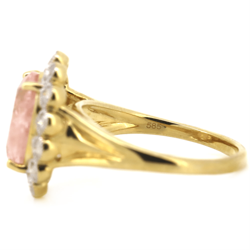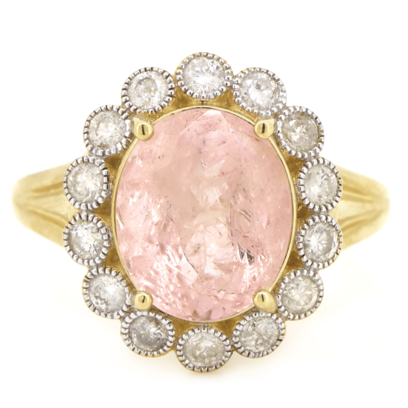 14K YELLOW/WHITE GOLD, MORGANITE AND DIAMOND, HALO RING. The Centre Features, One Oval Faceted Cut, Light-Medium Pink, Morganite (3.43Ct, Included), 4 Claw Set. Encompassing The Centre Design Are, 14 Round Brilliant Cut, Diamonds (0.59Ct Tdw, J-L Colour, P1-P2 Clarity), Bezel Set With Millgrain Detail. Ring Size O 1/2. Valuations Provided by an Independent Third-Party Professional Not Directly Associated With Lloyds Auctions at AUD $$9,800.00This valuation has been conducted by an independent third-party professional. The valuation amount is an assessment by the issuing valuer and does not reflect the auction value of the item. Any inquiries regarding the valuation should be directed to the issuing valuer (refer to contact details on the certificate), as Lloyds Auctions has no affiliation or influence over the valuation, the valuer, or the stated amount. Condition: Good - Refer Images 0645909+1645