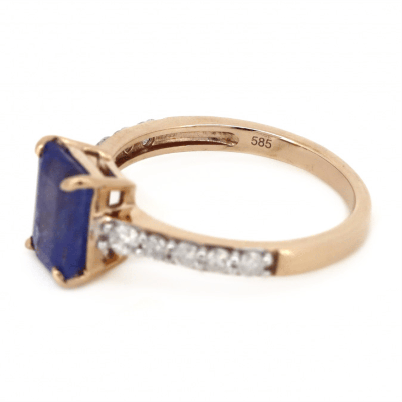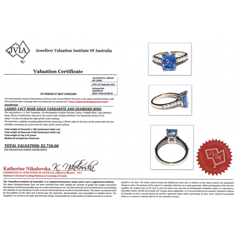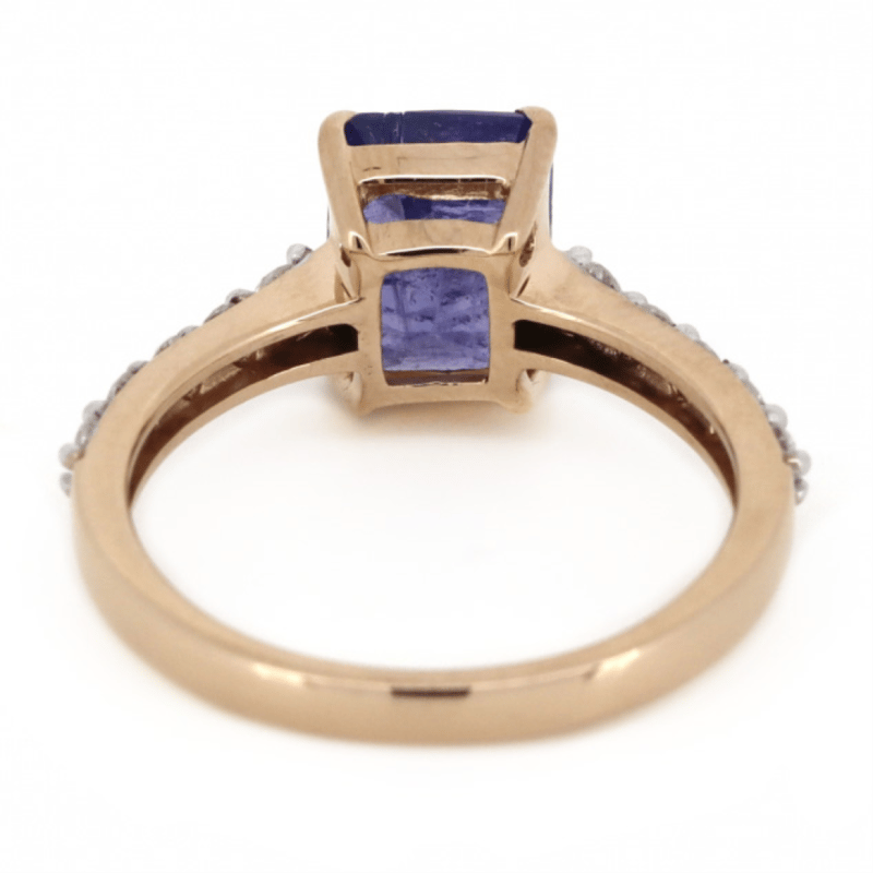 14K ROSE GOLD, TANZANITE AND DIAMOND, CLASSIC RING. The Centre Features, One Rectangular Cushion Faceted Cut, Purplish-Blue, Tanzanite (1.76Ct, Included), 4 Claw Set. Decorating The Band Are, 10 Round Brilliant Cut, Diamonds (0.30Ct Tdw, I-K Colour, P1-P2 Clarity), Claw Set. Ring Size L. The Tanzanite Has Some Small Natural Inclusions That Have Reached The Surface. Valuations Provided by an Independent Third-Party Professional Not Directly Associated With Lloyds Auctions at AUD $$5,750.00This valuation has been conducted by an independent third-party professional. The valuation amount is an assessment by the issuing valuer and does not reflect the auction value of the item. Any inquiries regarding the valuation should be directed to the issuing valuer (refer to contact details on the certificate), as Lloyds Auctions has no affiliation or influence over the valuation, the valuer, or the stated amount. Condition: Good - Refer Images 0645909+1649