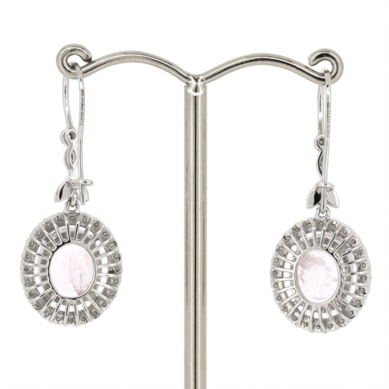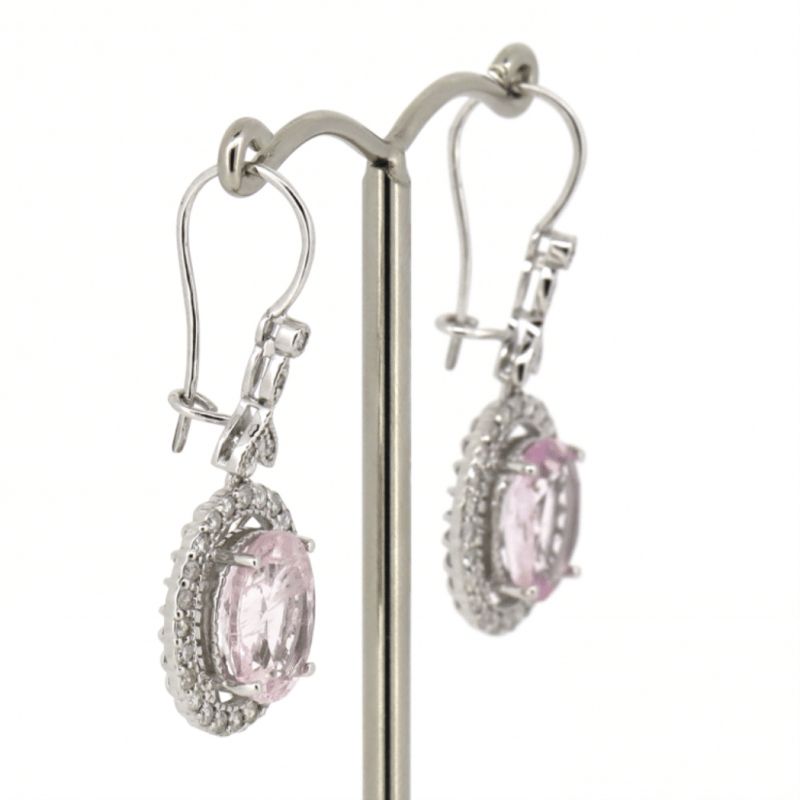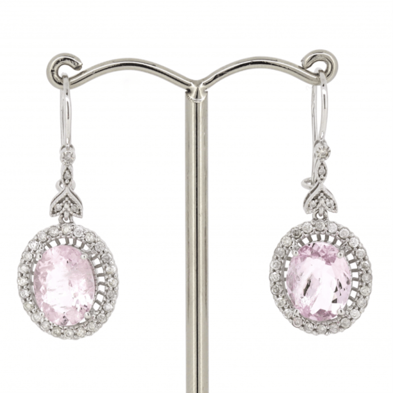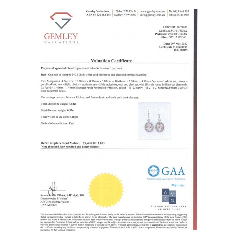 14K WHITE GOLD, MORGANITE AND DIAMOND, HALO DROP EARRINGS. The Centres Feature, 2 Oval Cut, Light Purplish-Pink, Morganites (4.54Ct Tsw, Moderate Eye Visible Inclusions), Claw Set. Surrounding The Centres In Halos And Decorating The Drops Are, 56 Round Brilliant Cut, Diamonds (0.57Ct Tdw, H-J Colour, Si2-I2 Clarity), Bezel/Bead/Micro-Claw Set With Mill Grain Detail. The Earrings Have Latch Backs. Valuations Provided by an Independent Third-Party Professional Not Directly Associated With Lloyds Auctions at AUD $$9,490.00This valuation has been conducted by an independent third-party professional. The valuation amount is an assessment by the issuing valuer and does not reflect the auction value of the item. Any inquiries regarding the valuation should be directed to the issuing valuer (refer to contact details on the certificate), as Lloyds Auctions has no affiliation or influence over the valuation, the valuer, or the stated amount. Condition: Good - Refer Images 0645909+1656