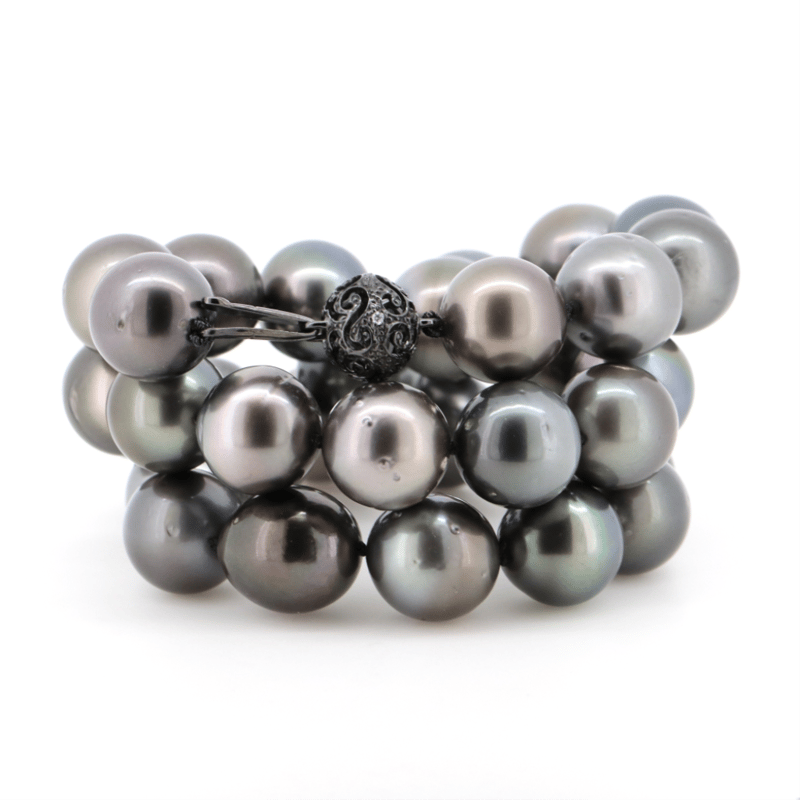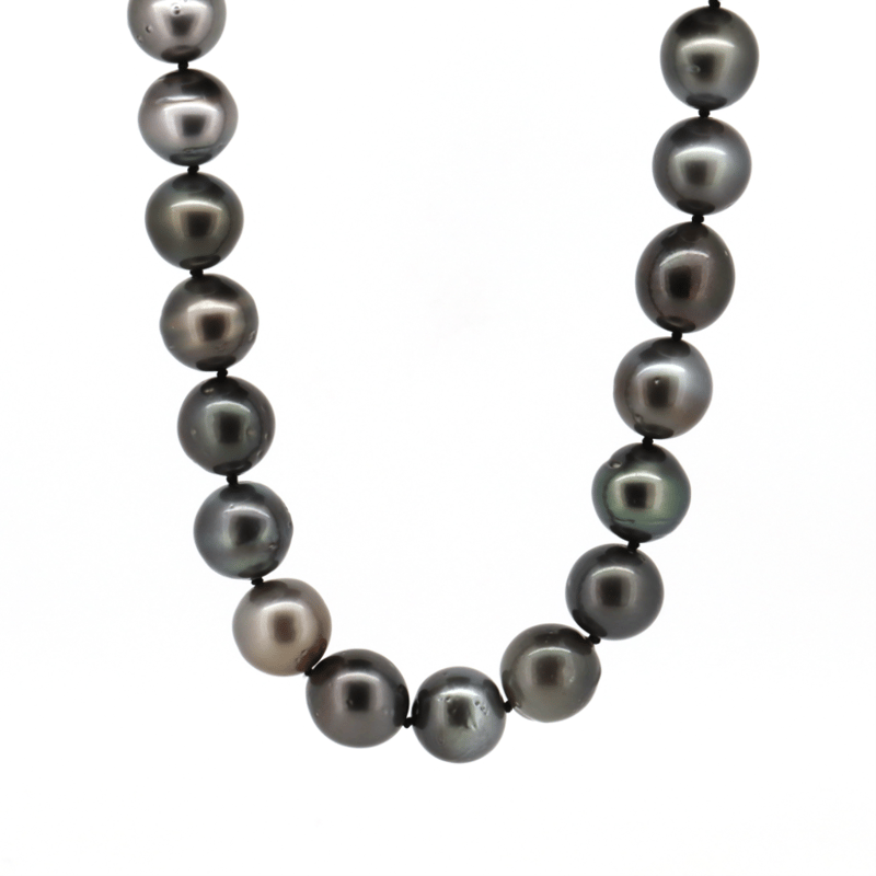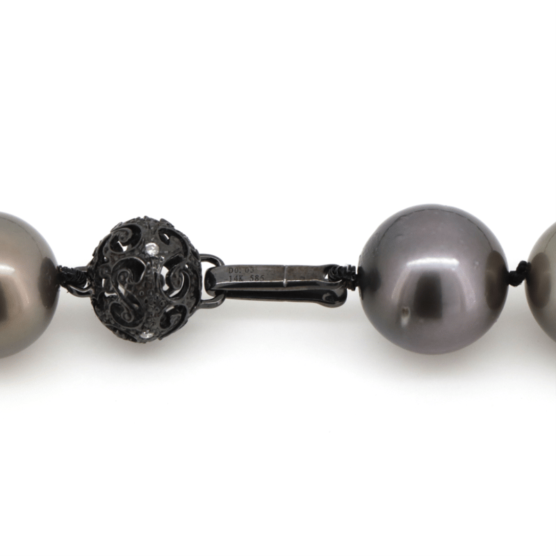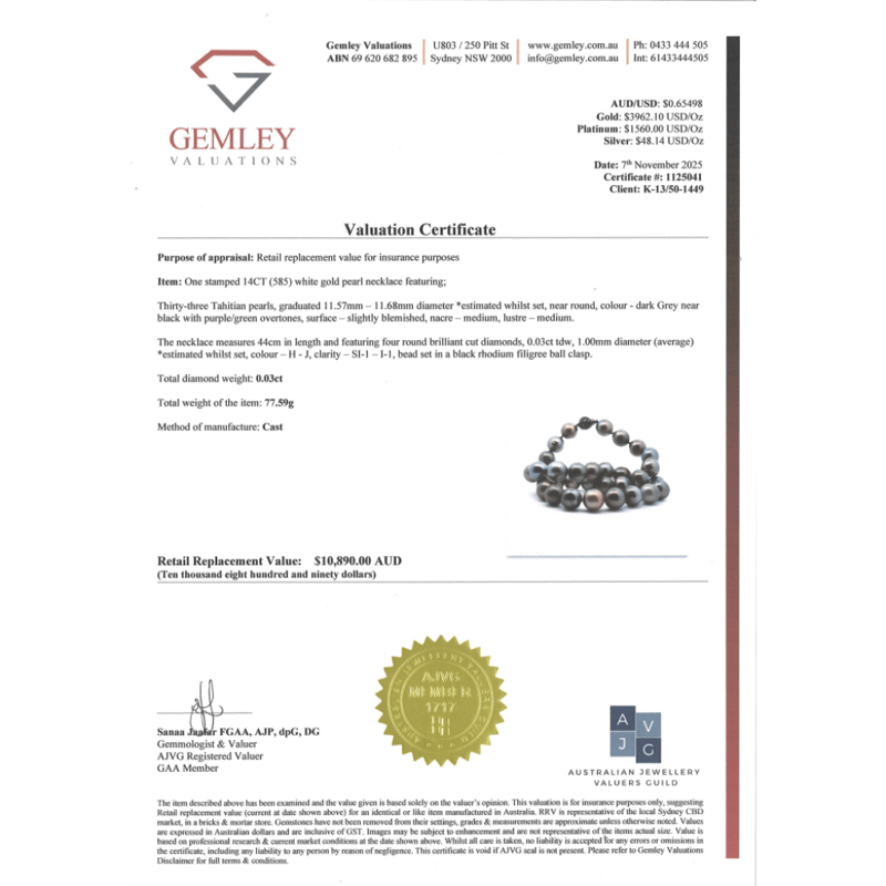 14K WHITE GOLD (BLACK RHODIUM), BLACK CULTURED TAHITIAN PEARL AND DIAMOND, STRAND NECKLACE. The Design Features, 33 Near Round, Black With Purple/Green Overtones, Cultured Tahitian Pearls (11.57Mm-11.68Mm Size, Medium Lustre, Slightly Blemished). Embellishing The 14K White Gold (Black Rhodium Plated), Filigree Ball Clasp Are, 4 Round Brilliant Cut, Diamonds (0.03Ct Tdw, H-J Colour, Si1-I1 Clarity), Bead Set. Length Is 44Cm. Valuations Provided by an Independent Third-Party Professional Not Directly Associated With Lloyds Auctions at AUD $$10,890.00This valuation has been conducted by an independent third-party professional. The valuation amount is an assessment by the issuing valuer and does not reflect the auction value of the item. Any inquiries regarding the valuation should be directed to the issuing valuer (refer to contact details on the certificate), as Lloyds Auctions has no affiliation or influence over the valuation, the valuer, or the stated amount. Condition: Good - Refer Images 0645909+1668