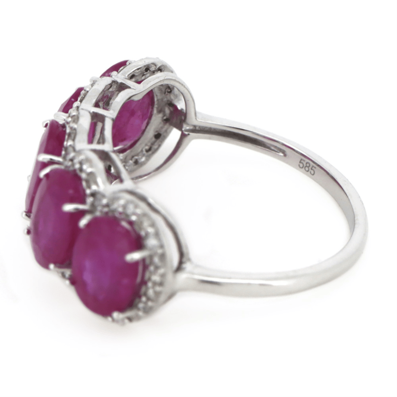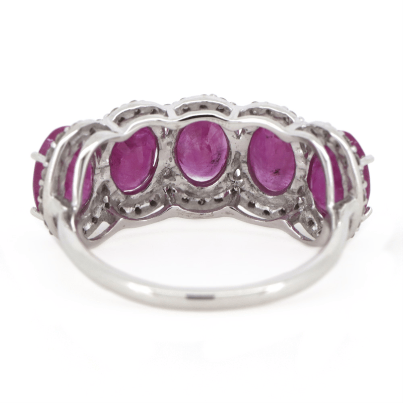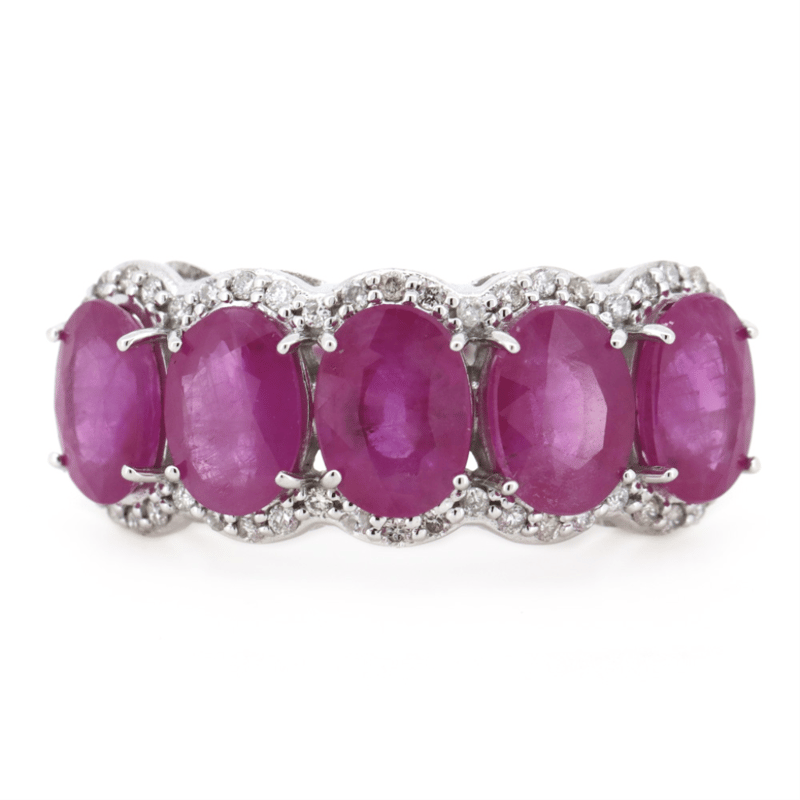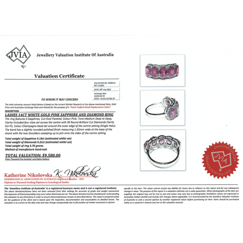 14K WHITE GOLD, PINK SAPPHIRE AND DIAMOND, ETERNITY RING. The Central Design Features, 5 Oval Faceted Cut, Medium-Deep Pink, Sapphires (4.16Ct Tsw, Included), 4 Claw Set. Surrounding The Centre Settings In A Halo Are, 50 Round Brilliant Cut, Champagne, Diamonds (0.21Ct Tdw, Si2-P2 Clarity), Bead Set. Ring Size M. Valuations Provided by an Independent Third-Party Professional Not Directly Associated With Lloyds Auctions at AUD $$9,580.00This valuation has been conducted by an independent third-party professional. The valuation amount is an assessment by the issuing valuer and does not reflect the auction value of the item. Any inquiries regarding the valuation should be directed to the issuing valuer (refer to contact details on the certificate), as Lloyds Auctions has no affiliation or influence over the valuation, the valuer, or the stated amount. Condition: Good - Refer Images 0645909+1672