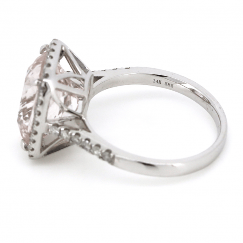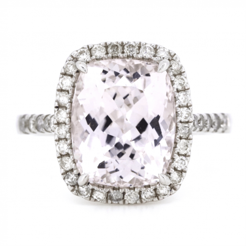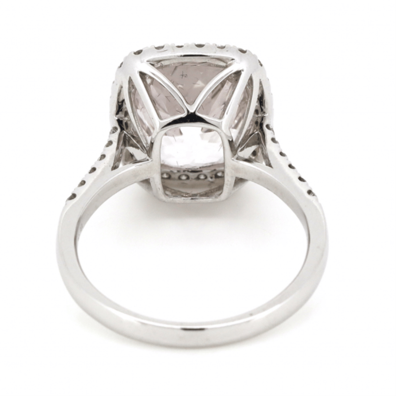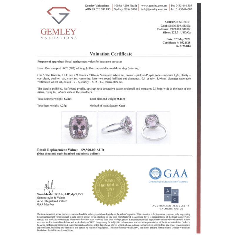 14K WHITE GOLD, KUNZITE AND DIAMOND, HALO RING. The Centre Features, One Cushion Cut, Medium Light Pinkish-Purple, Kunzite (5.32Ct, Eye Clean Clarity), Claw Set. Surrounding The Centre In A Halo And Decorating The Band Are, 42 Round Brilliant Cut, Diamonds (0.41Ct Tdw, J-K Colour, Si2-I2 Clarity), Micro-Claw Set. Ring Size M. Valuations Provided by an Independent Third-Party Professional Not Directly Associated With Lloyds Auctions at AUD $$9,890.00This valuation has been conducted by an independent third-party professional. The valuation amount is an assessment by the issuing valuer and does not reflect the auction value of the item. Any inquiries regarding the valuation should be directed to the issuing valuer (refer to contact details on the certificate), as Lloyds Auctions has no affiliation or influence over the valuation, the valuer, or the stated amount. Condition: Good - Refer Images 0645909+1676