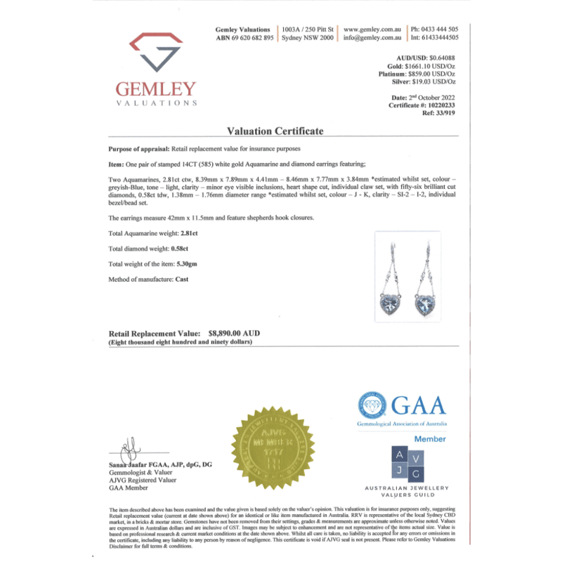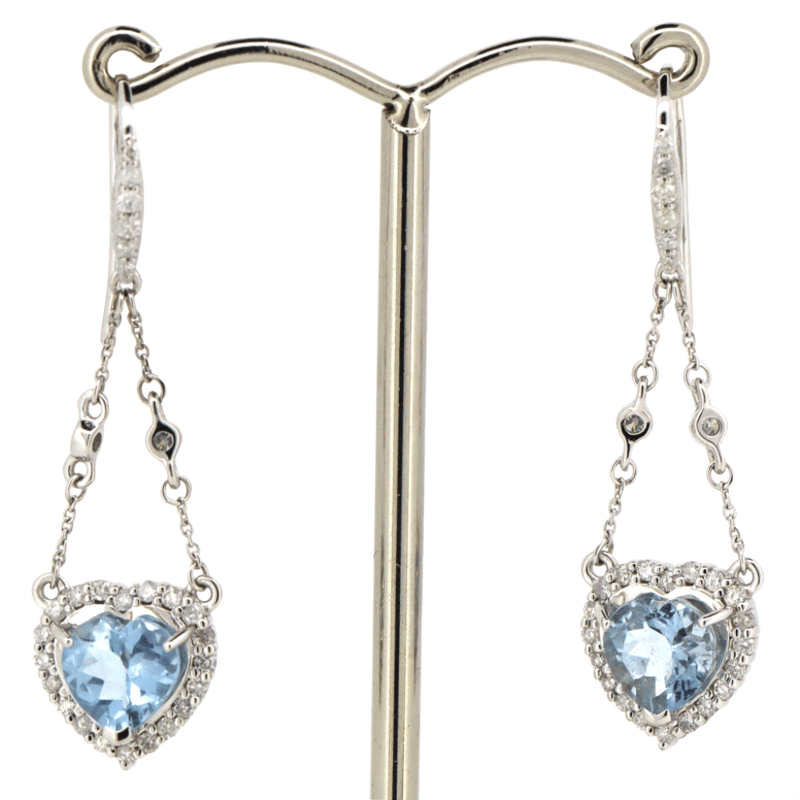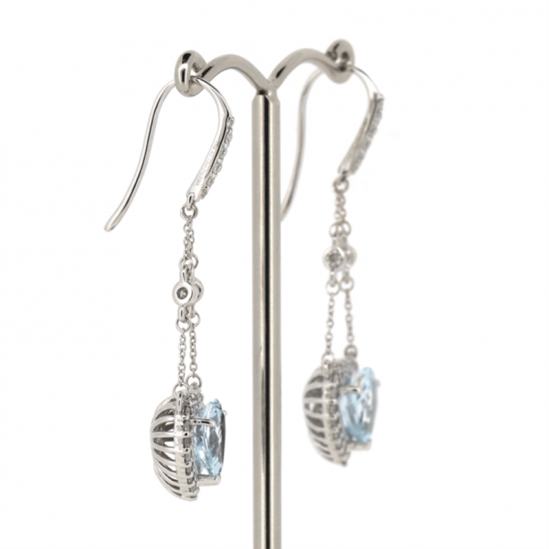14K WHITE GOLD, AQUAMARINE AND DIAMOND, CHANDELIER EARRINGS. The Centres Feature, 2 Heart Cut, Light Greyish-Blue, Aquamarines (2.22Ct Tsw, Minor Eye Visible Inclusions), Individual Claw Set. Surrounding The Centres Feature, 56 Round Brilliant Cut, Diamonds (0.59Ct Tdw, J-K Colour, Si2-I2 Clarity), Individual Bezel/Bead Set. The Earrings Have Shepherd Hooks. Valuations Provided by an Independent Third-Party Professional Not Directly Associated With Lloyds Auctions at AUD $$8,890.00This valuation has been conducted by an independent third-party professional. The valuation amount is an assessment by the issuing valuer and does not reflect the auction value of the item. Any inquiries regarding the valuation should be directed to the issuing valuer (refer to contact details on the certificate), as Lloyds Auctions has no affiliation or influence over the valuation, the valuer, or the stated amount. Condition: Good - Refer Images 0645909+1679