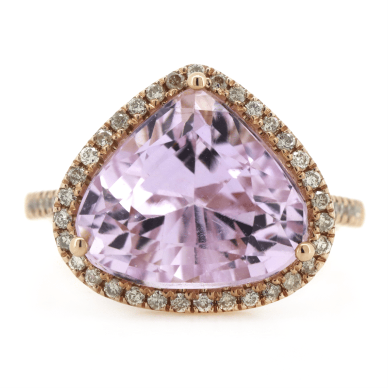 The Centre Features, One Trillion Cut, Light Purplish-Pink, Kunzite (7.54Ct, Eye Clean Clarity), 3 Claw Set. Surrounding The Centre In A Halo And Decorating The Band Are, 49 Round Brilliant Cut, Diamonds (0.31Ct Tdw, J-K Colour, Si2-I2 Clarity), Micro-Claw Set. Ring Size M 1/2.