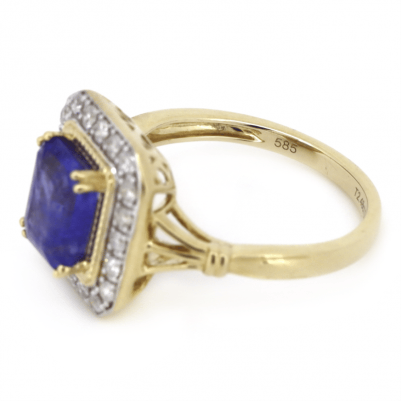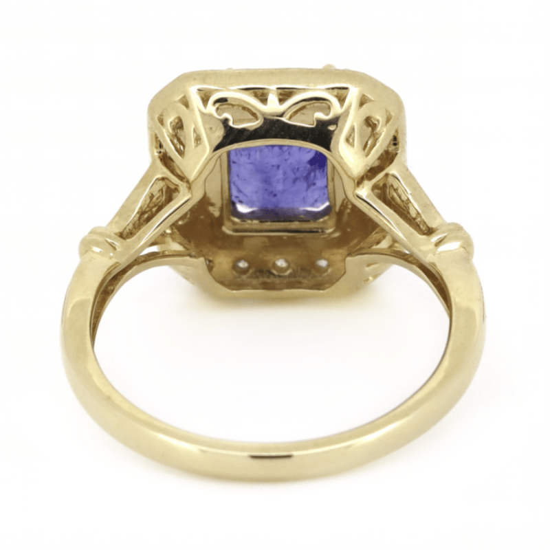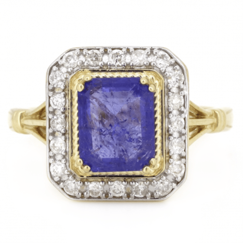 14K YELLOW GOLD, TANZANITE AND DIAMOND, ANTIQUE INSPIRED HALO RING. The Centre Features, One Emerald Cut, Medium Purplish-Blue, Tanzanite (2.29Ct, Moderate Eye Visible Inclusions), Double Four Claw Set With A Millegrain Detail Halo. Surrounding The Centre In A Halo Are, 20 Round Brilliant Cut, Diamonds (0.32Ct Tdw, J-K Colour, Si2-I2 Clarity), Bead Set In White Gold. Ring Size O. The Tanzanite Has Some Small Natural Inclusions That Have Reached The Surface. Valuations Provided by an Independent Third-Party Professional Not Directly Associated With Lloyds Auctions at AUD $$5,390.00This valuation has been conducted by an independent third-party professional. The valuation amount is an assessment by the issuing valuer and does not reflect the auction value of the item. Any inquiries regarding the valuation should be directed to the issuing valuer (refer to contact details on the certificate), as Lloyds Auctions has no affiliation or influence over the valuation, the valuer, or the stated amount. Condition: Good - Refer Images 0645909+1684