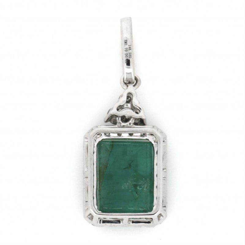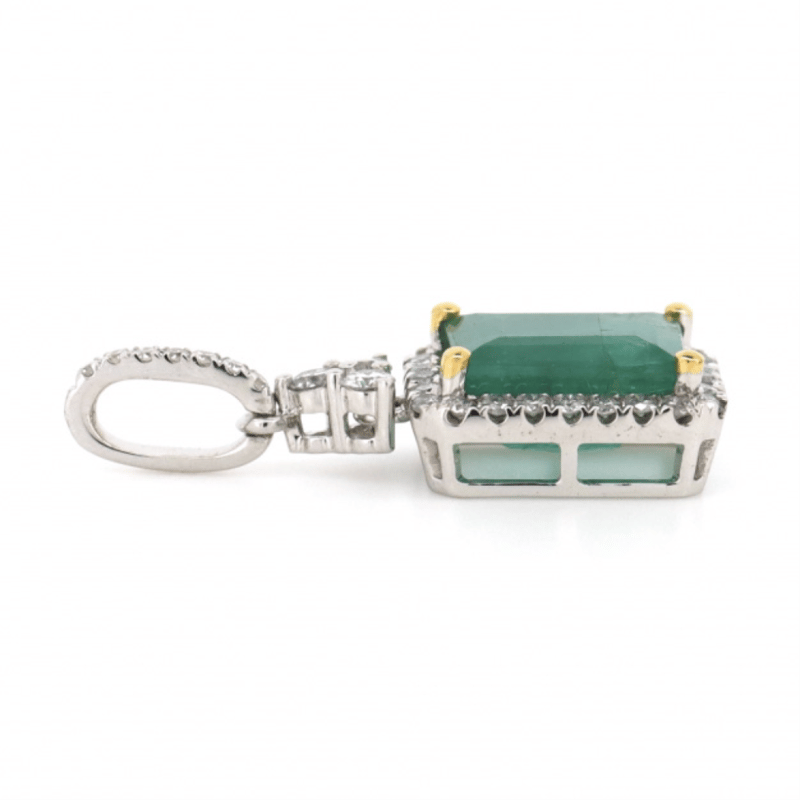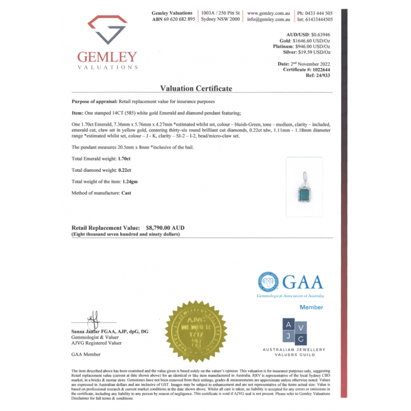 14K WHITE GOLD, EMERALD AND DIAMOND, HALO PENDANT. The Centre Features, One Emerald Cut, Bluish-Green, Emerald (1.70Ct, Included), 4 Claw Set In Yellow Gold. Surrounding The Centre In A Halo And Decorating The Bail Are, 36 Round Brilliant Cut, Diamonds (0.22Ct Tdw, J-K Colour, Si2-I2 Clarity), Bead/Micro-Claw Set. Valuations Provided by an Independent Third-Party Professional Not Directly Associated With Lloyds Auctions at AUD $$8,790.00This valuation has been conducted by an independent third-party professional. The valuation amount is an assessment by the issuing valuer and does not reflect the auction value of the item. Any inquiries regarding the valuation should be directed to the issuing valuer (refer to contact details on the certificate), as Lloyds Auctions has no affiliation or influence over the valuation, the valuer, or the stated amount. Condition: Good - Refer Images 0645909+1687