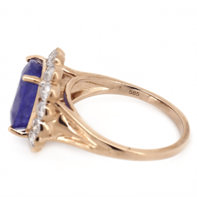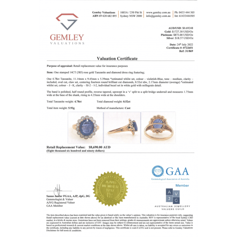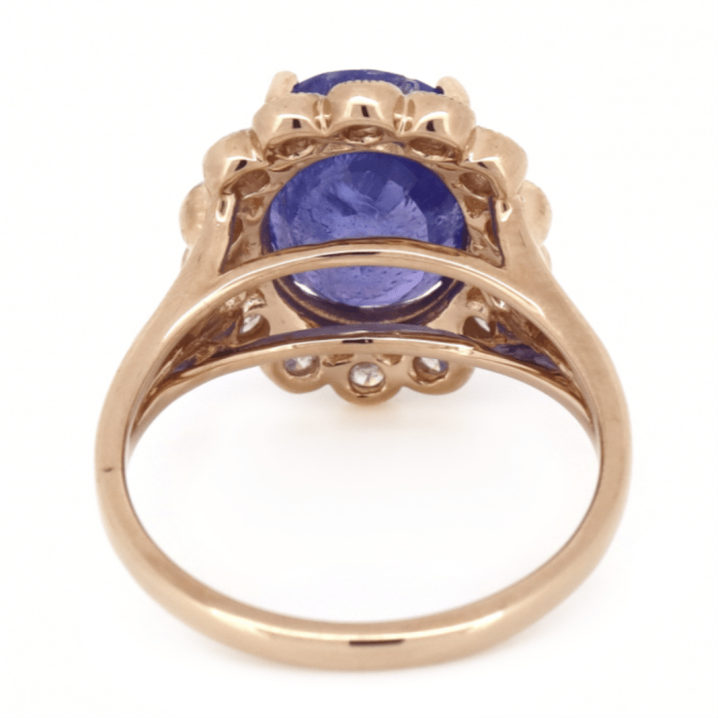 14K ROSE GOLD, TANZANITE AND DIAMOND, HALO RING. The Centre Features, One Oval Cut, Medium Violetish-Blue, Tanzanite (4.78Ct, Included), Bezel Set. Surrounding The Centre In A Halo Are, 14 Round Brilliant Cut, Diamonds (0.52Ct Tdw, J-K Colour, Si2-I1 Clarity), Bezel/Bead Set. Ring Size P. Valuations Provided by an Independent Third-Party Professional Not Directly Associated With Lloyds Auctions at AUD $$8,690.00This valuation has been conducted by an independent third-party professional. The valuation amount is an assessment by the issuing valuer and does not reflect the auction value of the item. Any inquiries regarding the valuation should be directed to the issuing valuer (refer to contact details on the certificate), as Lloyds Auctions has no affiliation or influence over the valuation, the valuer, or the stated amount. Condition: Good - Refer Images 0645909+1691