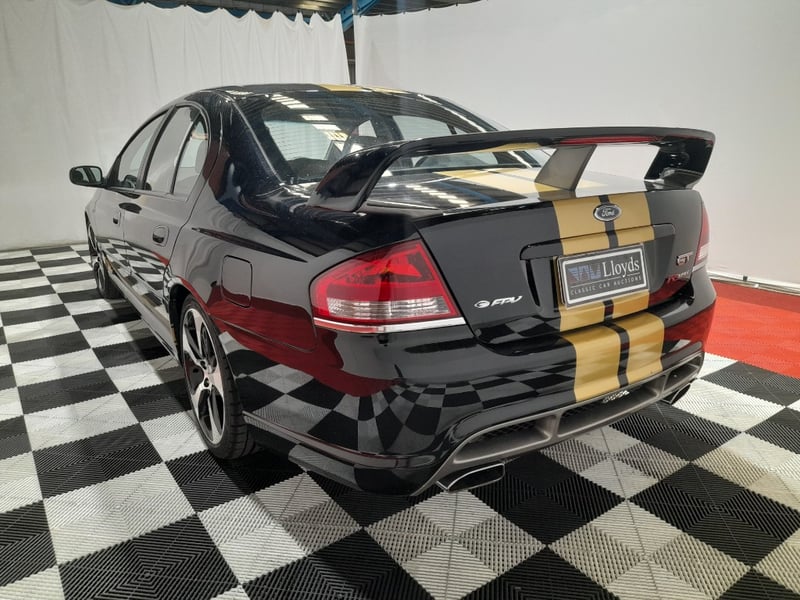 2007 FPV GT BF Mk II R‑Spec four‑door sedan, finished in Black and built to commemorate FPV’s 40th Anniversary. Rear‑wheel drive configuration powered by a naturally aspirated 5.4‑litre V8 petrol engine paired with a six‑speed manual transmission. Odometer indicating a very low 23,672 kilometres.