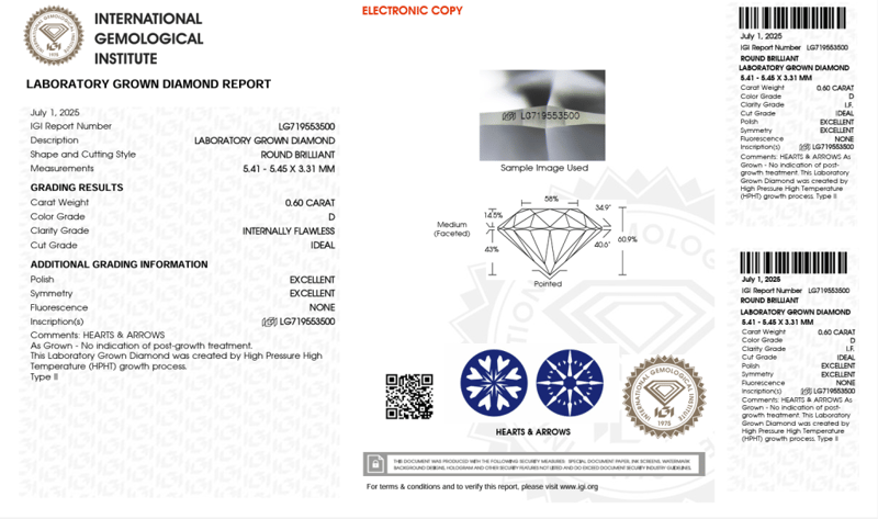 Please note that while all lab grown diamonds listed include certification, the report number or identification may vary upon arrival. This is due to standard manufacturing and batching processes. However, the diamond’s specifications — including carat, color, cut, and clarity — will match or may even exceed those advertised.