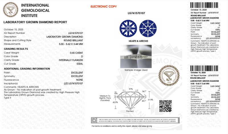 Please note that while all lab grown diamonds listed include certification, the report number or identification may vary upon arrival. This is due to standard manufacturing and batching processes. However, the diamond’s specifications — including carat, color, cut, and clarity — will match or may even exceed those advertised.